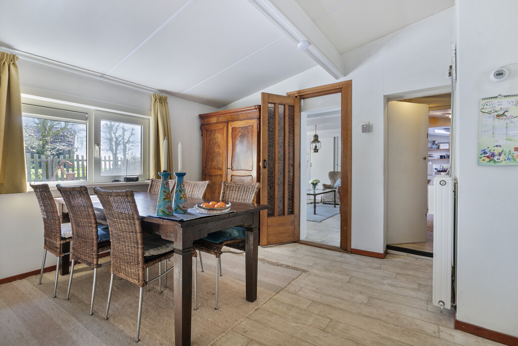 De zonnige voortuin op het zuiden beschikt over een mooi terras waar u de hele dag van de zon kunt genieten. Daarnaast beschikt de woning over een ruime garage met openslaande deuren en een separate houten berging – ideaal voor het stallen van fietsen, tuingereedschap of als klusruimte.