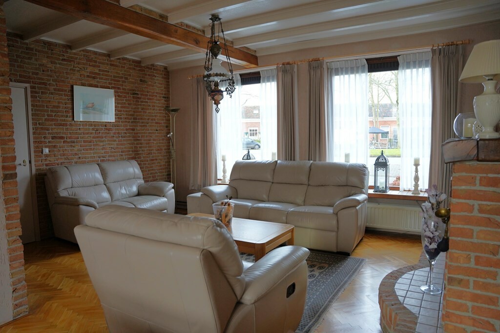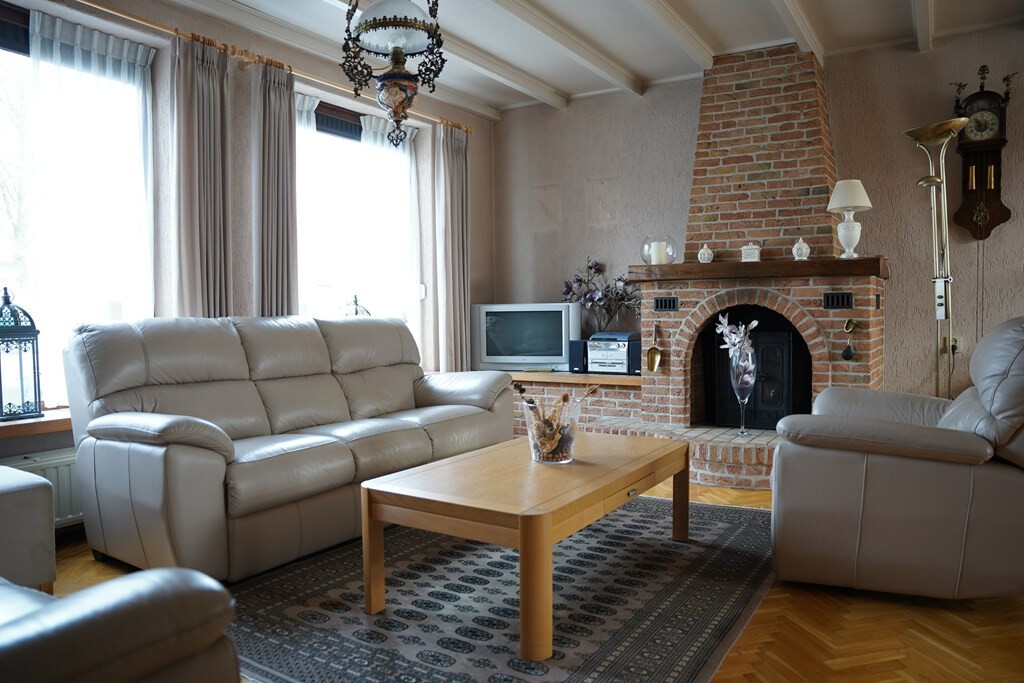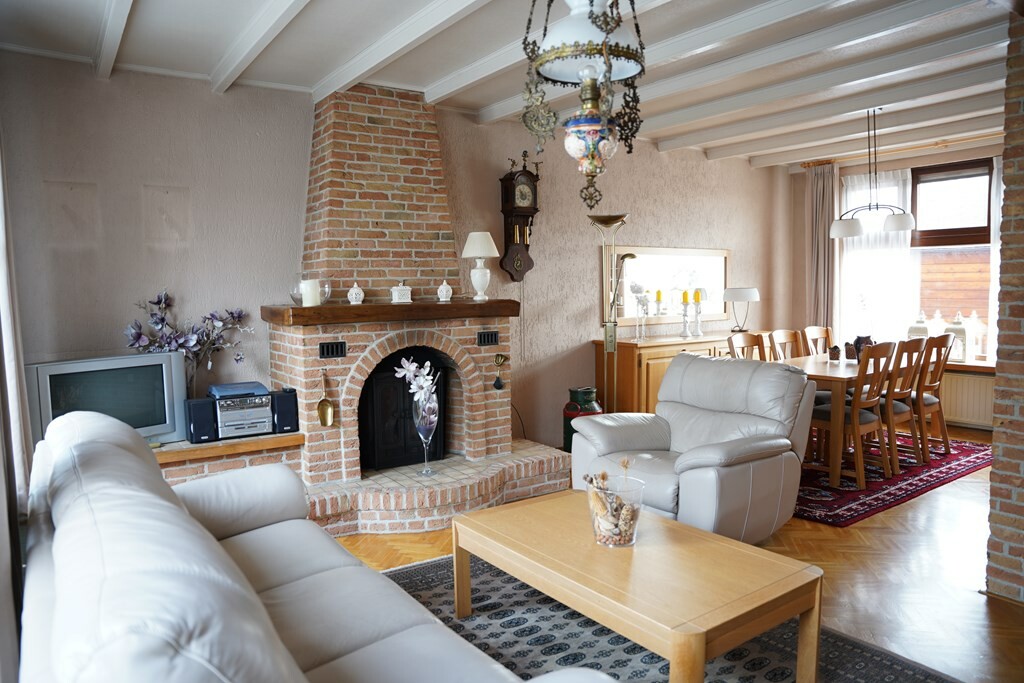 De L-vormige woonkamer heeft een prachtige parketvloer en in de zithoek is een houtkachel met ventilator voor extra warmte en sfeer.