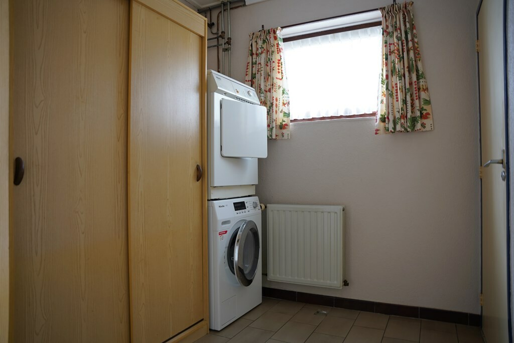 De woning heeft een bijkeuken met wasmachineaansluiting, voldoende bergruimte en een retro toilet.