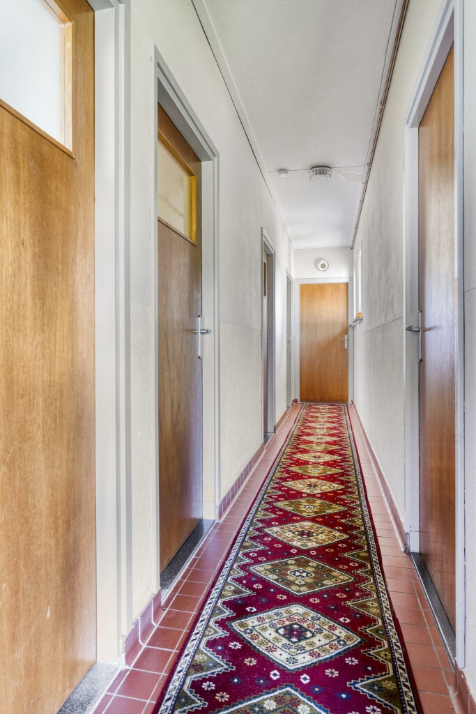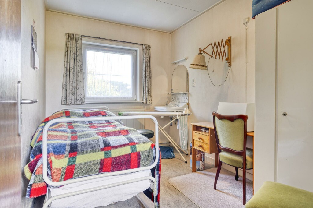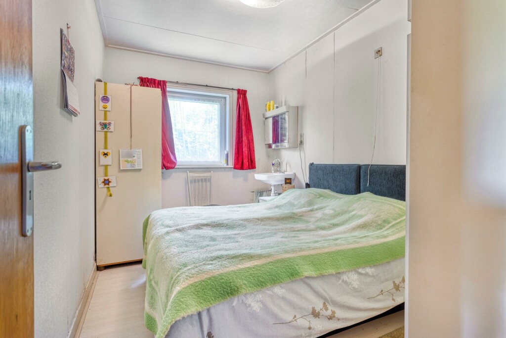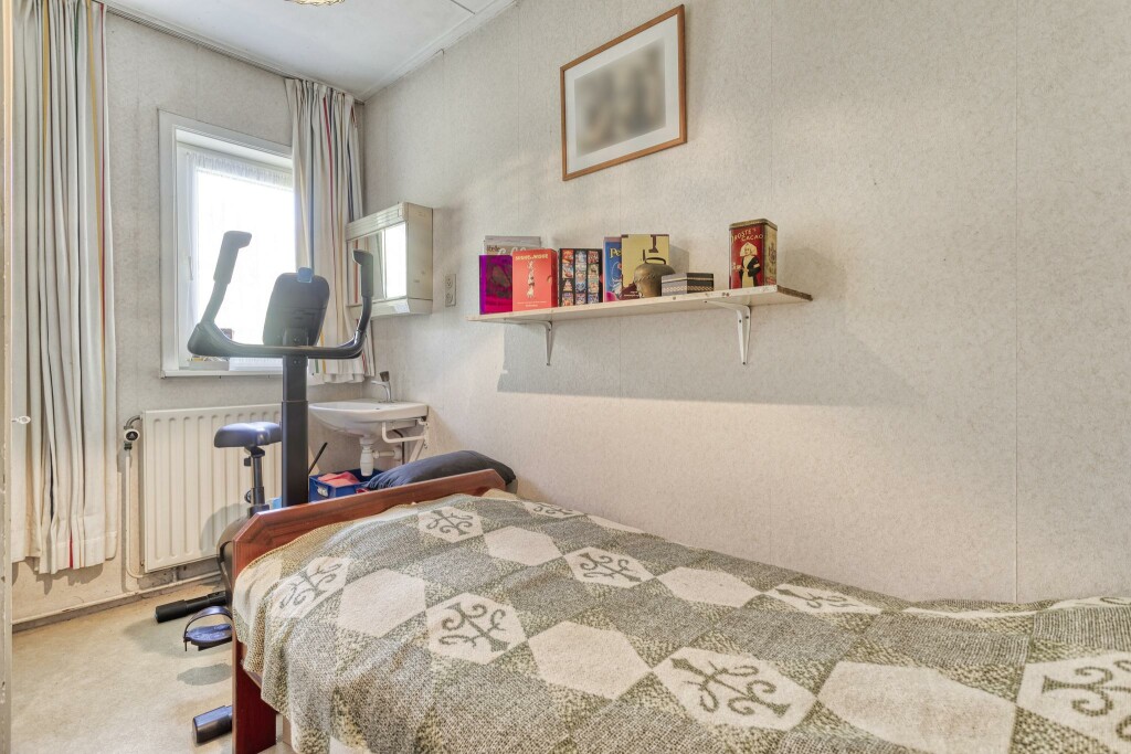 Bij binnenkomst komt u in de hal, die toegang biedt tot de woonkamer en de eetkeuken. De keuken is eenvoudig uitgevoerd en biedt voldoende ruimte voor dagelijks gebruik. Aansluitend aan de leefruimtes bevinden zich vier slaapkamers, waarvan drie zijn voorzien van een eigen wastafel. Vanuit de bijkeuken, waar zich ook het toilet bevindt, bereikt u de doucheruimte met een douche en wastafel. De bijkeuken biedt bovendien toegang tot de inpandige garage die voorzien is van een radiator, wat zorgt voor extra gebruiksgemak en opbergruimte.