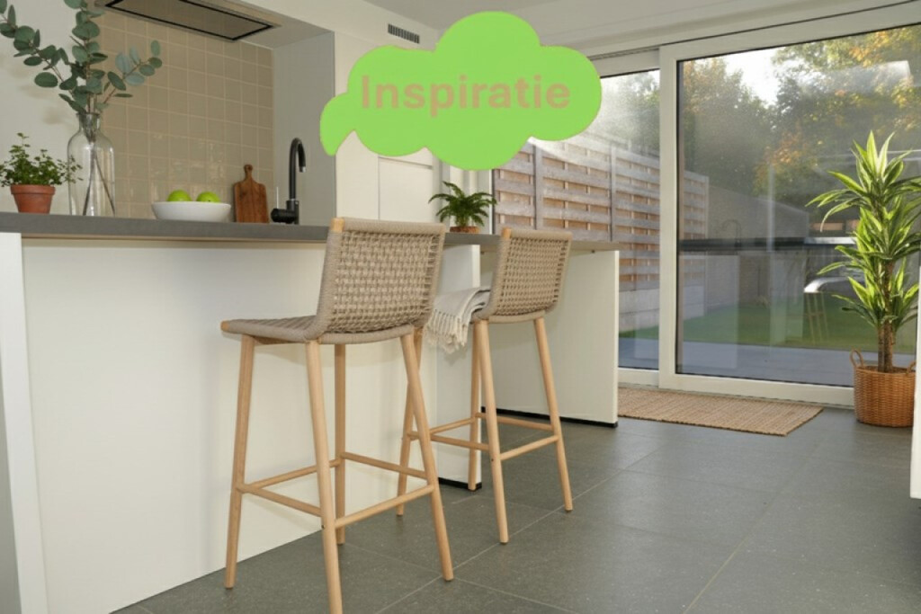 Vanuit de eetkamer kom je via twee treden in de iets hoger gelegen aanbouw. Hier vind je de moderne woonkeuken met spoeleiland en een bartafel. Voorzien van alle eigentijdse apparatuur is koken hier een plezier. De lichtkoepel en de schuifpui zorgen voor een zee van daglicht.
