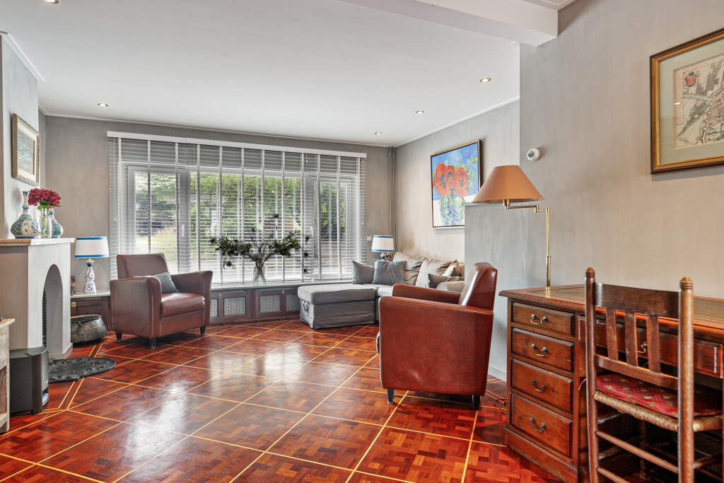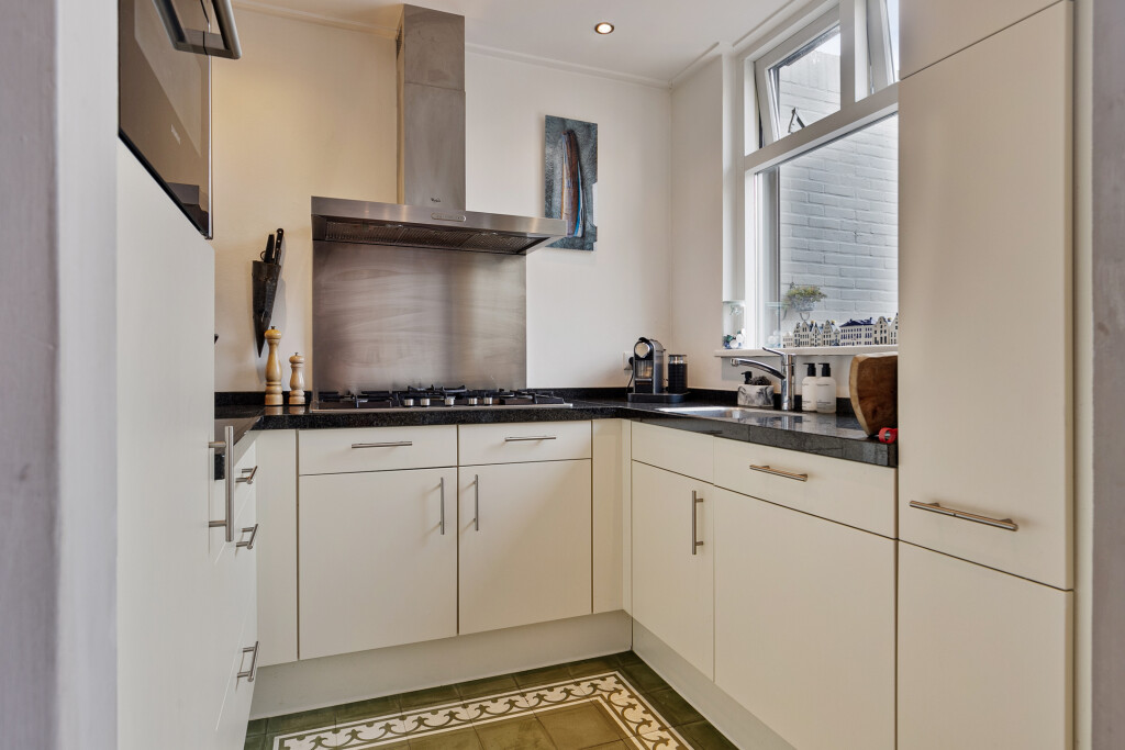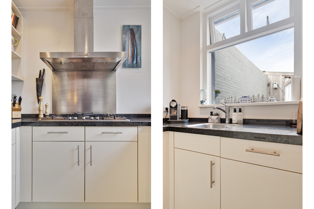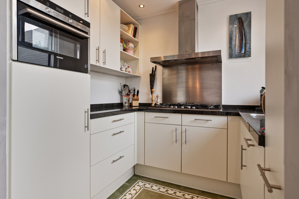 Bij binnenkomst treft u een ruime hal die toegang biedt tot de badkamer, uitgerust met een douche, toilet en wastafelmeubel. Vervolgens komt u in de lichte en ruime woonkamer, voorzien van een gezellige open haard en een stijlvolle parketvloer. De open keuken, uitgerust met hoogwaardige inbouwapparatuur zoals een 6-pits gaskookplaat, koelkast, vaatwasser, afzuigkap en een combi oven/magnetron, maakt deze ruimte ideaal voor gezellige diners en familieavonden. Vanuit de woonkamer heeft u middels openslaande deuren direct toegang tot de achtertuin.