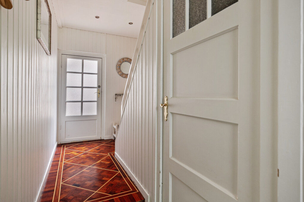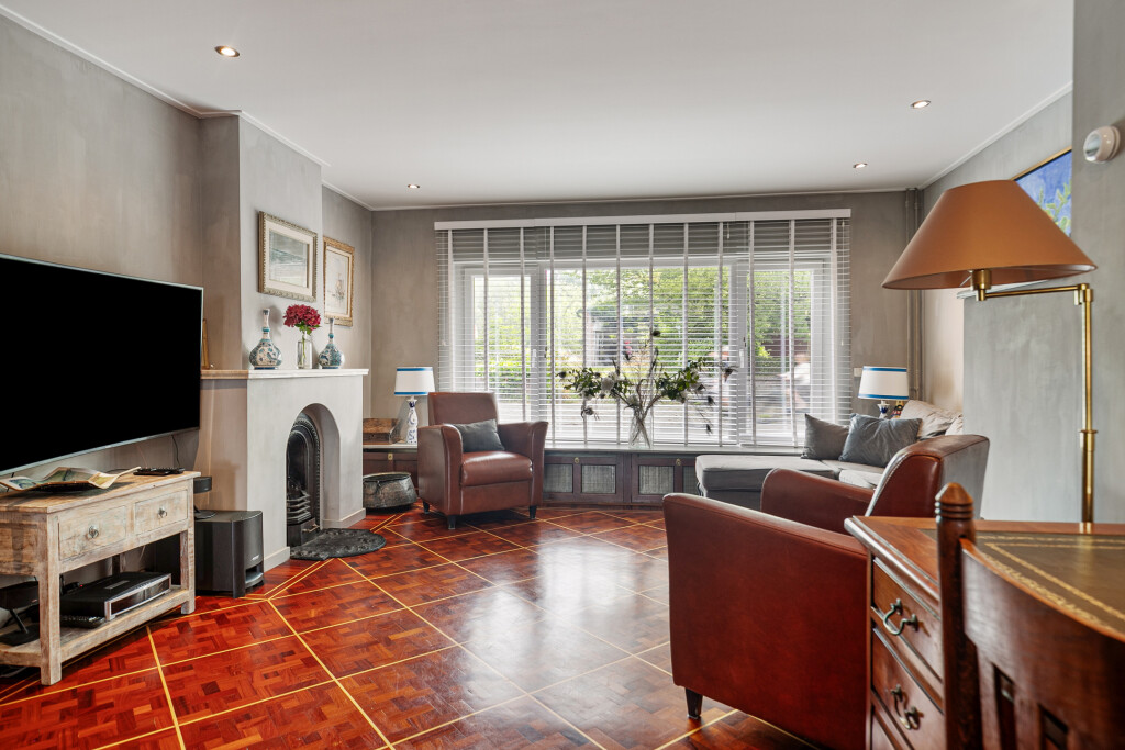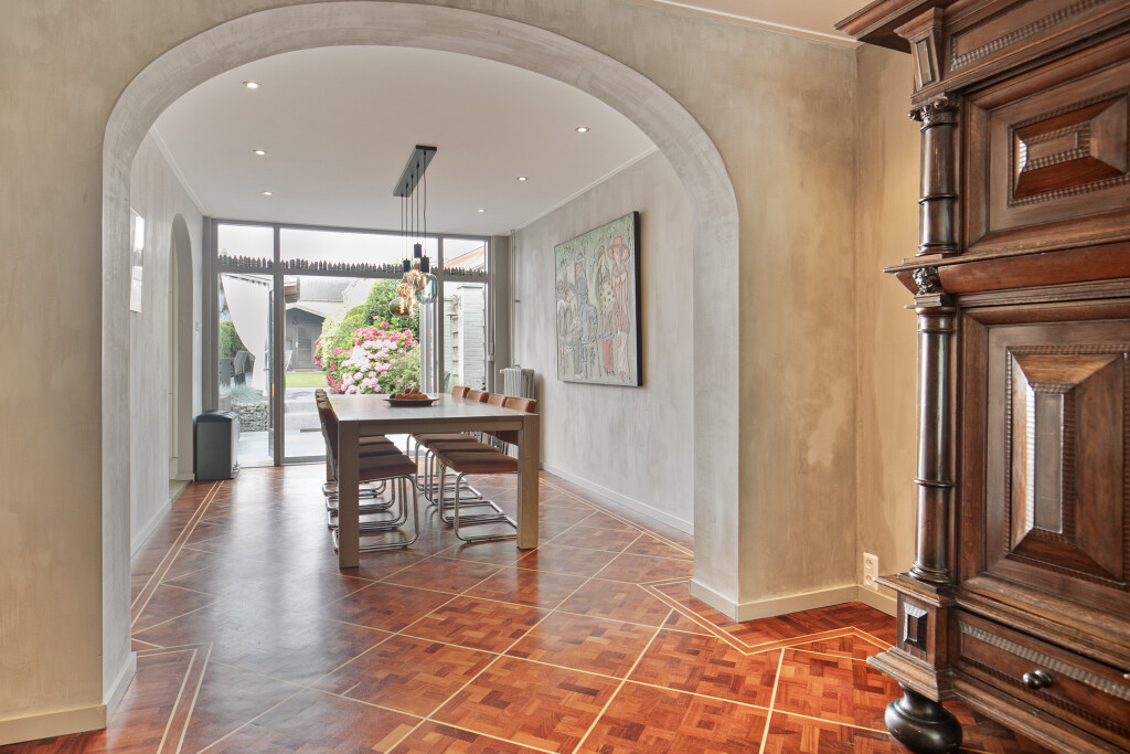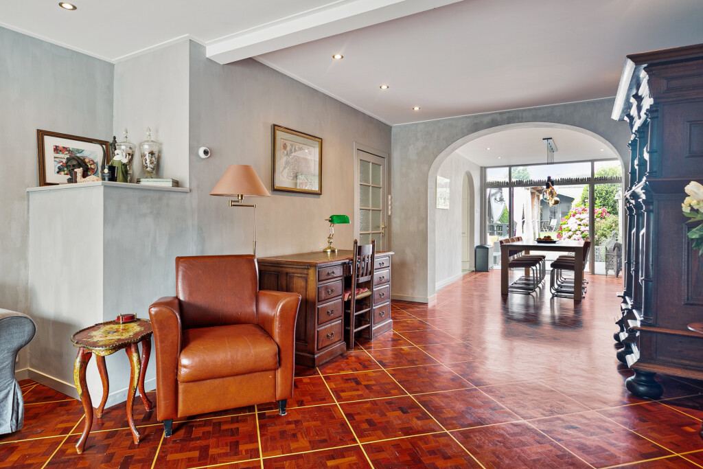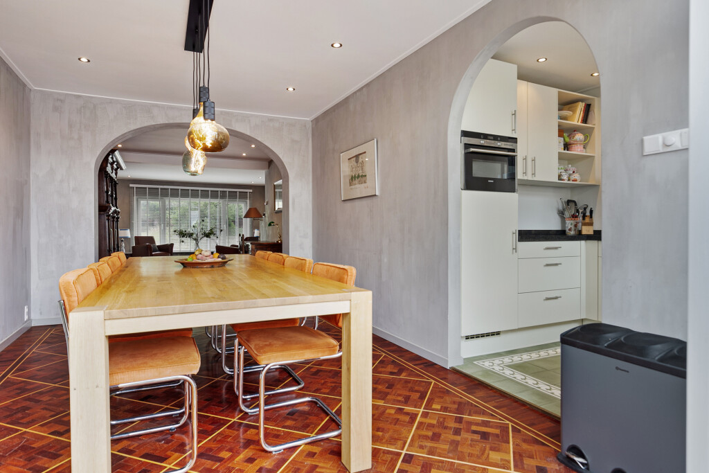 Bij binnenkomst treft u een ruime hal die toegang biedt tot de badkamer, uitgerust met een douche, toilet en wastafelmeubel. Vervolgens komt u in de lichte en ruime woonkamer, voorzien van een gezellige open haard en een stijlvolle parketvloer. De open keuken, uitgerust met hoogwaardige inbouwapparatuur zoals een 6-pits gaskookplaat, koelkast, vaatwasser, afzuigkap en een combi oven/magnetron, maakt deze ruimte ideaal voor gezellige diners en familieavonden. Vanuit de woonkamer heeft u middels openslaande deuren direct toegang tot de achtertuin.