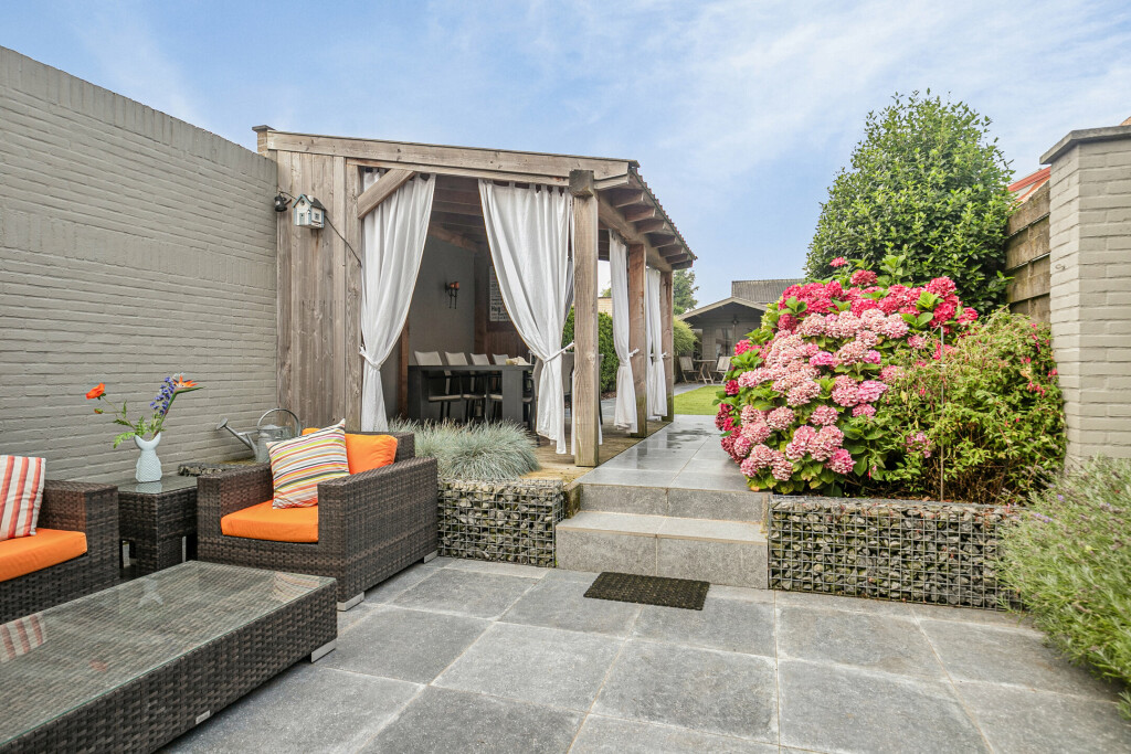 * diepe achtertuin op het zuidwesten met terras en overkapping;