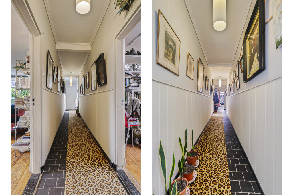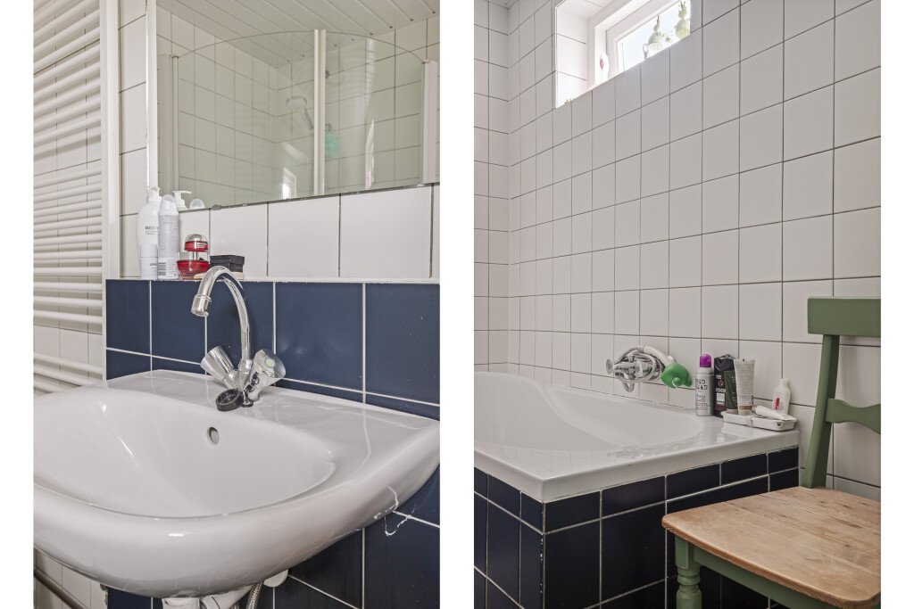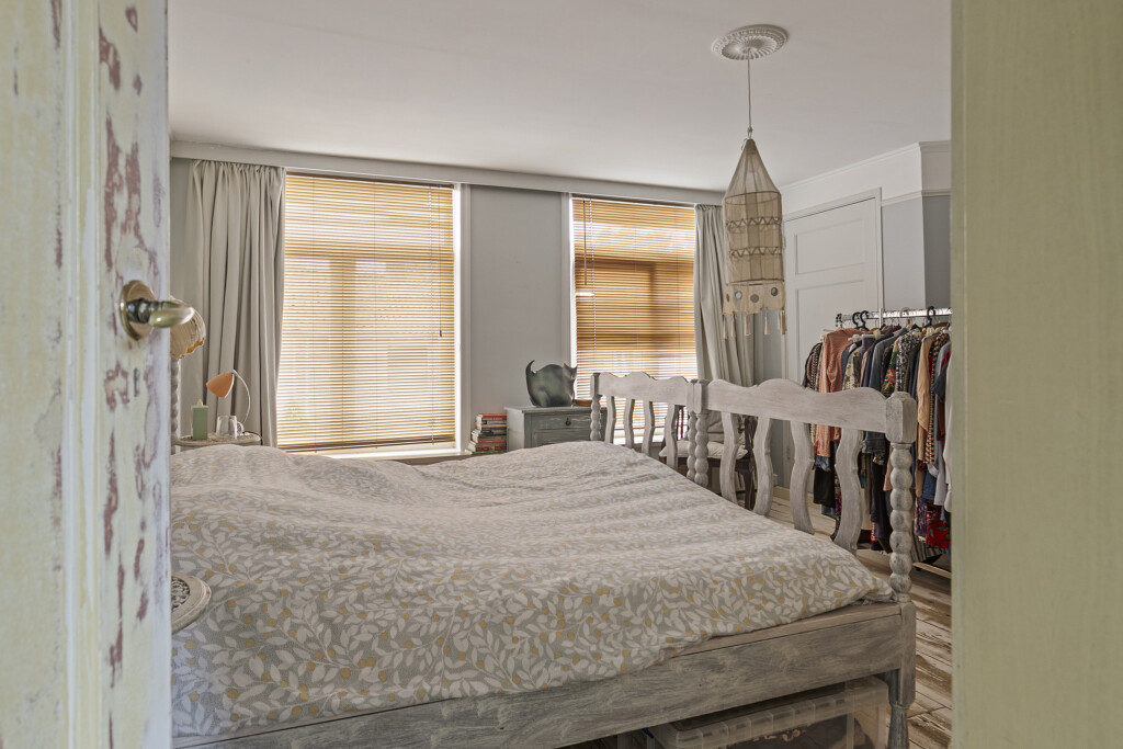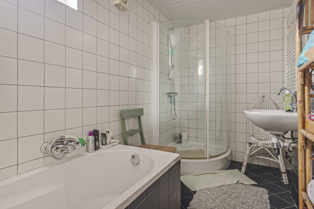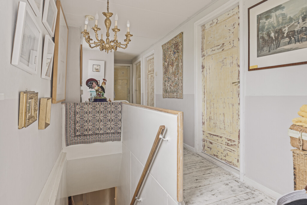 De overloop op de eerste verdieping geeft toegang tot alle vertrekken: drie ruime slaapkamers, waarvan één slaapkamer is uitgerust met vaste kasten. De badkamer is voorzien van een ligbad, wastafelmeubel en douche. Daarnaast beschikt de verdieping over een aparte toiletruimte en een ruimte met de trapopgang naar de zolder.