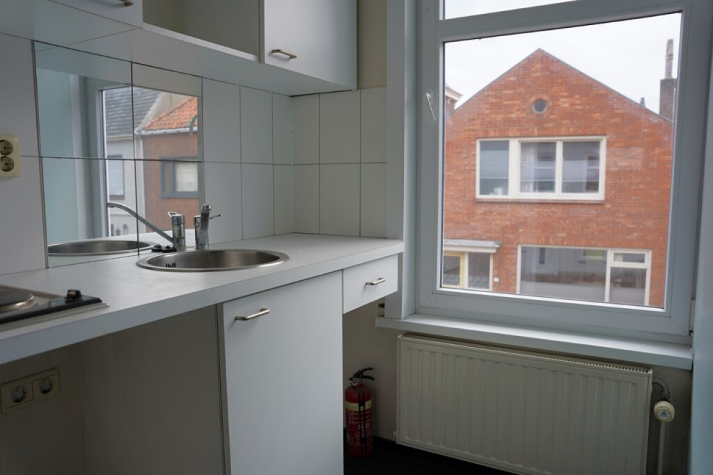 De keuken is uitgerust met een fornuis, oven en afzuigkap en biedt ruimte voor een moderne make-over. Er is een speelse extra ruimte in de keuken, voor bijvoorbeeld een gezellige bartafel.