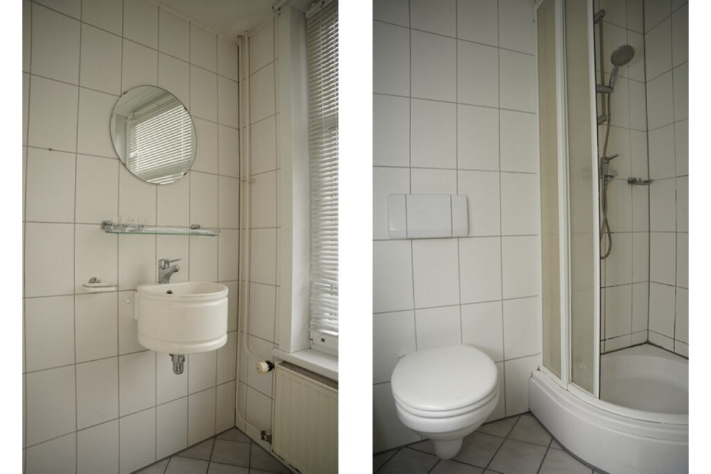 De badkamer is eenvoudig uitgevoerd met een douchecabine, toilet en wastafel.