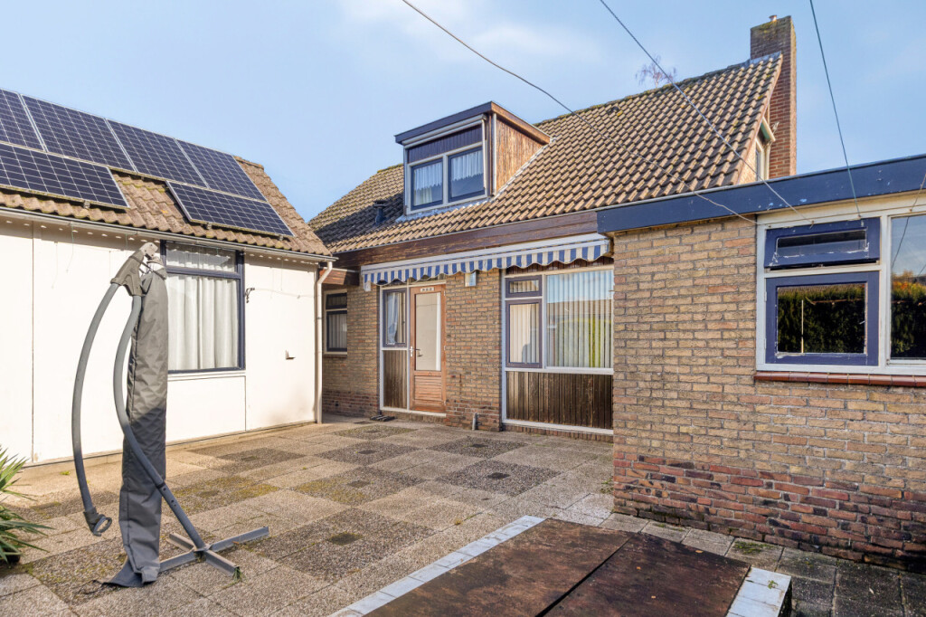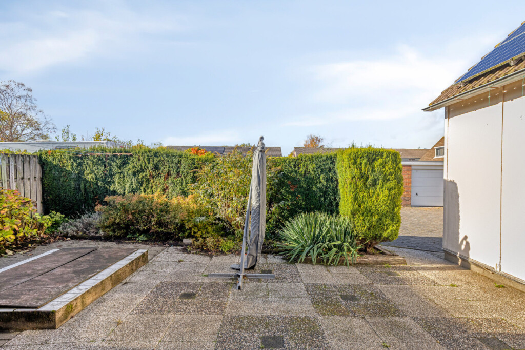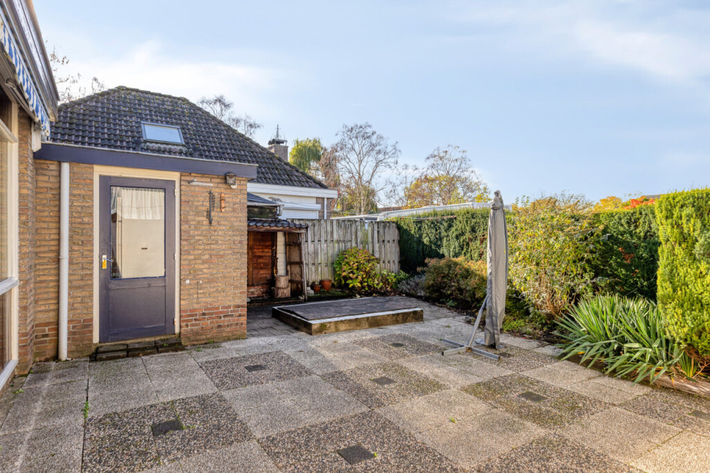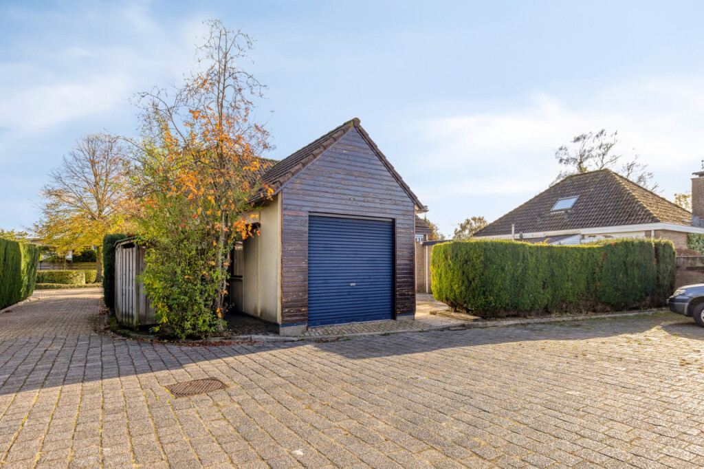 De woning beschikt over een stenen garage en een houten garage/berging; ideaal voor autoliefhebbers, klussers of voor extra opslag. Op het dak van de houten garage liggen zes zonnepanelen, wat bijdraagt aan lagere energiekosten. Naast de woning staat ook nog een houten schuurtje/overkapping voor tuingereedschap of fietsen. De achtertuin is knus en onderhoudsvriendelijk, met een zonnig terras waar je heerlijk beschut kunt zitten.