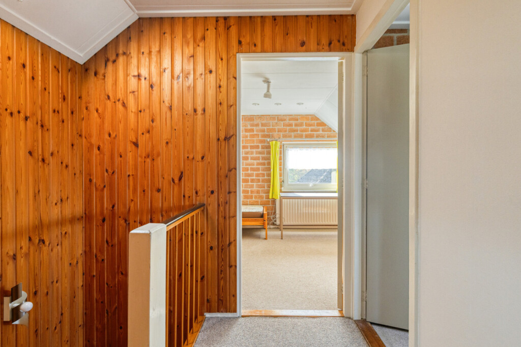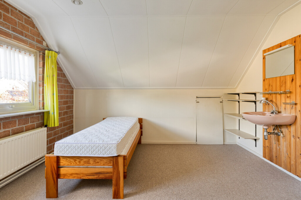 Ruime overloop met toegang tot 2 ruime slaapkamers, beide met eigen wastafel en bergruimte onder de schuine kanten. De 3e slaapkamer is klein/middelgroot met een dakkapel.
