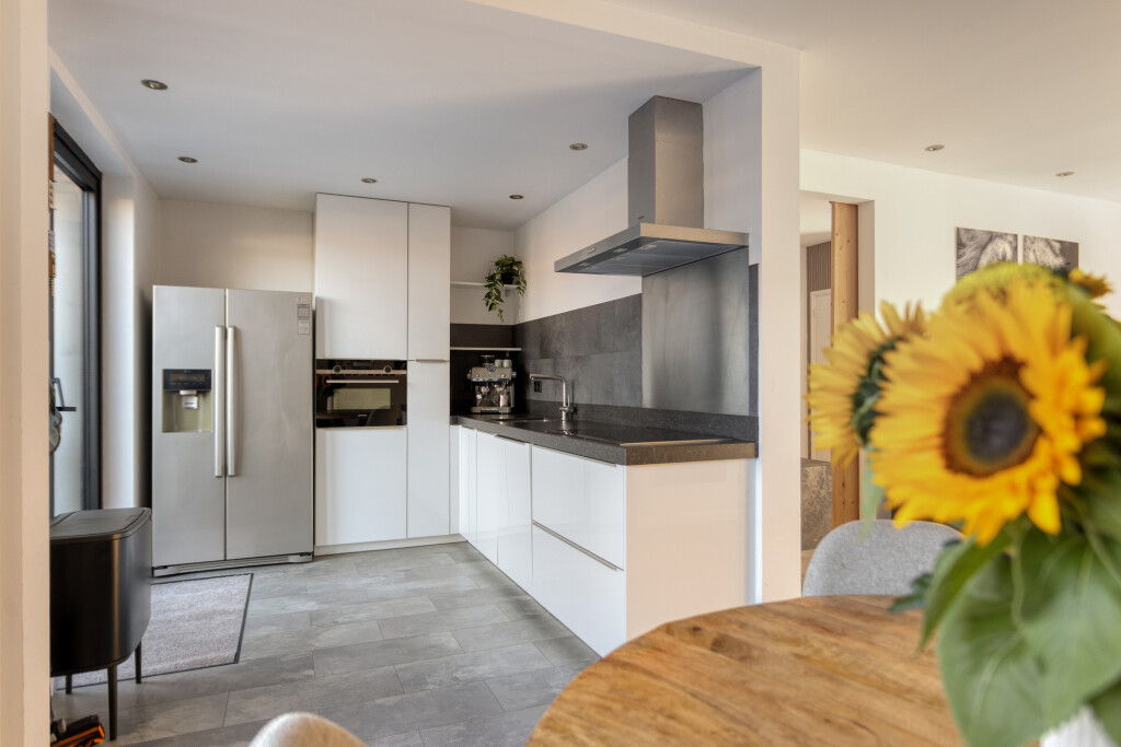 Bij binnenkomst stap je de hal binnen, die toegang biedt tot de trap naar de eerste verdieping, een provisiekast, het toilet en de meterkast. Vanuit de hal loop je door naar de lichte doorzonkamer, waar grote ramen zorgen voor veel daglicht en de haard voor een warme, gezellige sfeer in de wintermaanden. De moderne open keuken in hoekopstelling is uitgerust met diverse inbouwapparatuur en biedt een fijne plek om te koken, terwijl je vanuit de keuken direct contact hebt met de tuin.