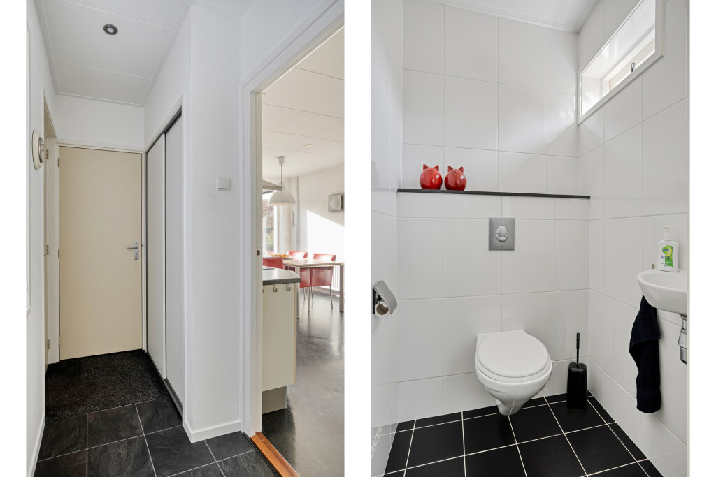 De toiletruimte is geheel betegeld en voorzien van een modern hangtoilet met fonteintje.