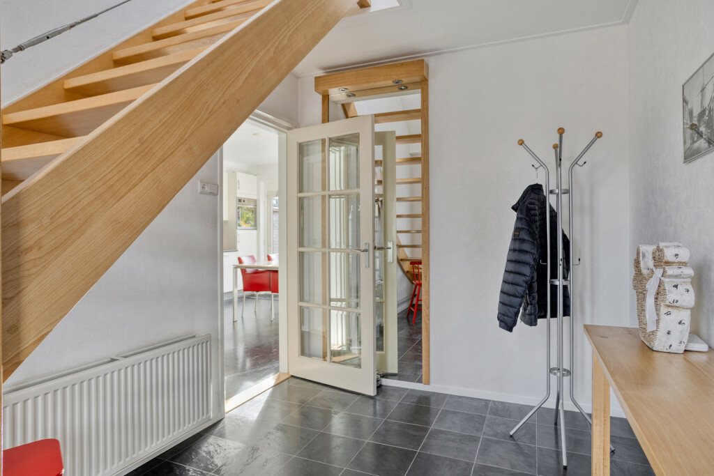Via de entree komt u in de lichte hal met laminaatvloer en een open trap naar de eerste verdieping. Vanuit de hal komt u in de woonkeuken, vandaar kunt u naar een werkkamer (slaapkamer), de woonkamer, de achterdeur naar buiten en naar een tweede hal met een meterkast, voorraadkast, toegang naar het toilet, inloopdouche en garage.