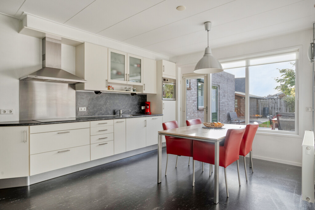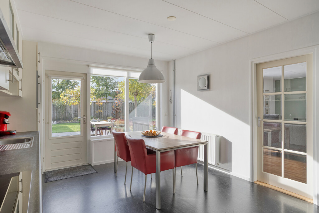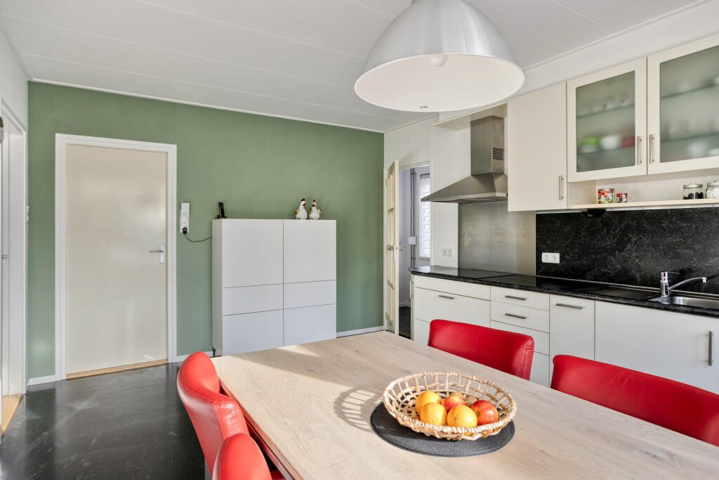 De woonkeuken is heerlijk licht en ruim van opzet. De keuken is uitgevoerd in een rechte opstelling en voorzien van diverse inbouwapparatuur. De linoleumvloer is praktisch en onderhoudsvriendelijk. Vanuit de keuken heeft u toegang tot de achtertuin, het kantoor/slaapkamer en de woonkamer.