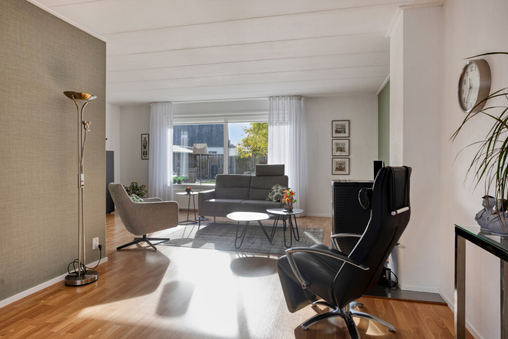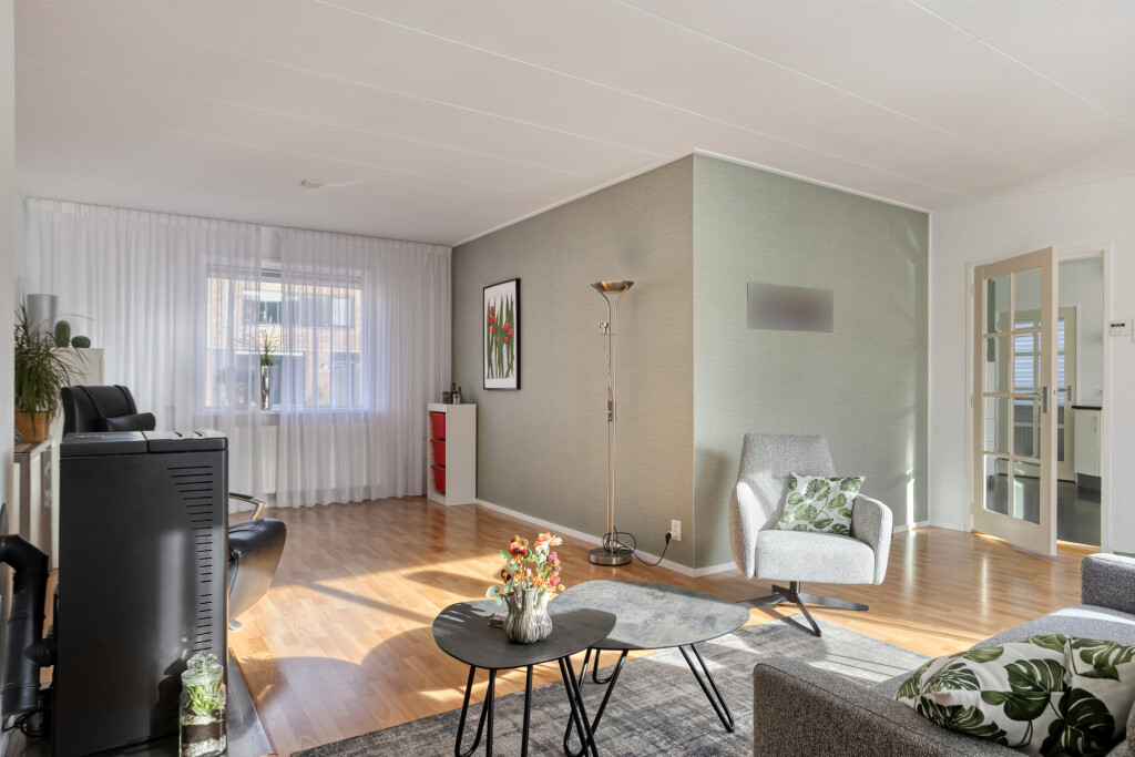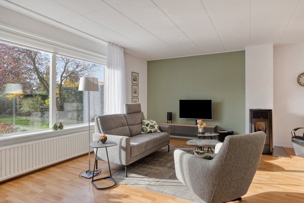 De woonkamer is een fijne plek om te ontspannen: ruim van formaat, met een warme laminaatvloer en een behaaglijke pelletkachel. Dankzij de grote ramen met screens geniet u van veel daglicht en behoudt u in de zomer een aangename temperatuur.