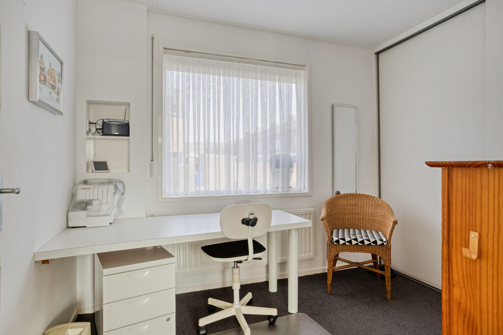 Aan de voorzijde bevindt zich een kantoorruimte, die eenvoudig is om te vormen tot slaapkamer. De kamer is voorzien van vloerbedekking, een inbouwkast en een rolluik – ideaal als werkplek of slaapkamer.