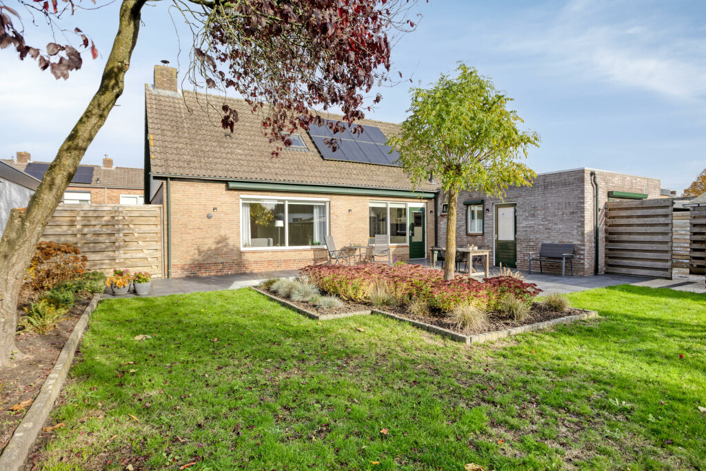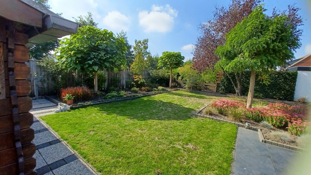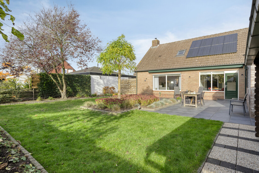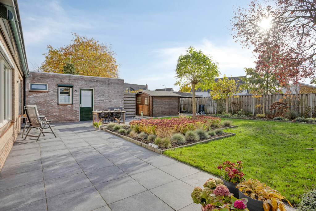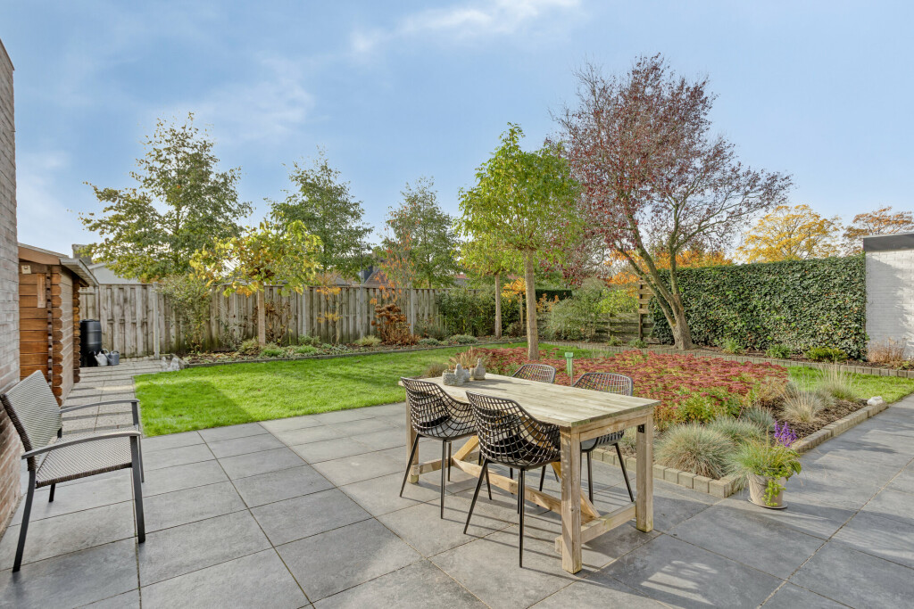 De fraaie achtertuin is gelegen op het zuiden – dus volop zon! Hier geniet u van rust, privacy en een mooi groen uitzicht. De tuin is aangelegd met diverse borders, sierbeplanting en een gazon. Aan de achterzijde bevindt zich een groot zonnescherm over het terras, zodat u ook op warme dagen comfortabel buiten zit. Achterin de tuin staat een houten tuinhuis met overkapping, ideaal voor het opbergen van tuingereedschap of als knusse zithoek.
