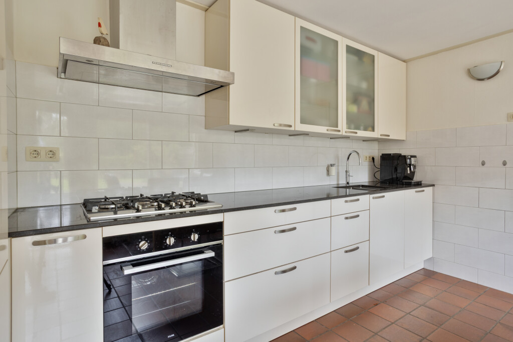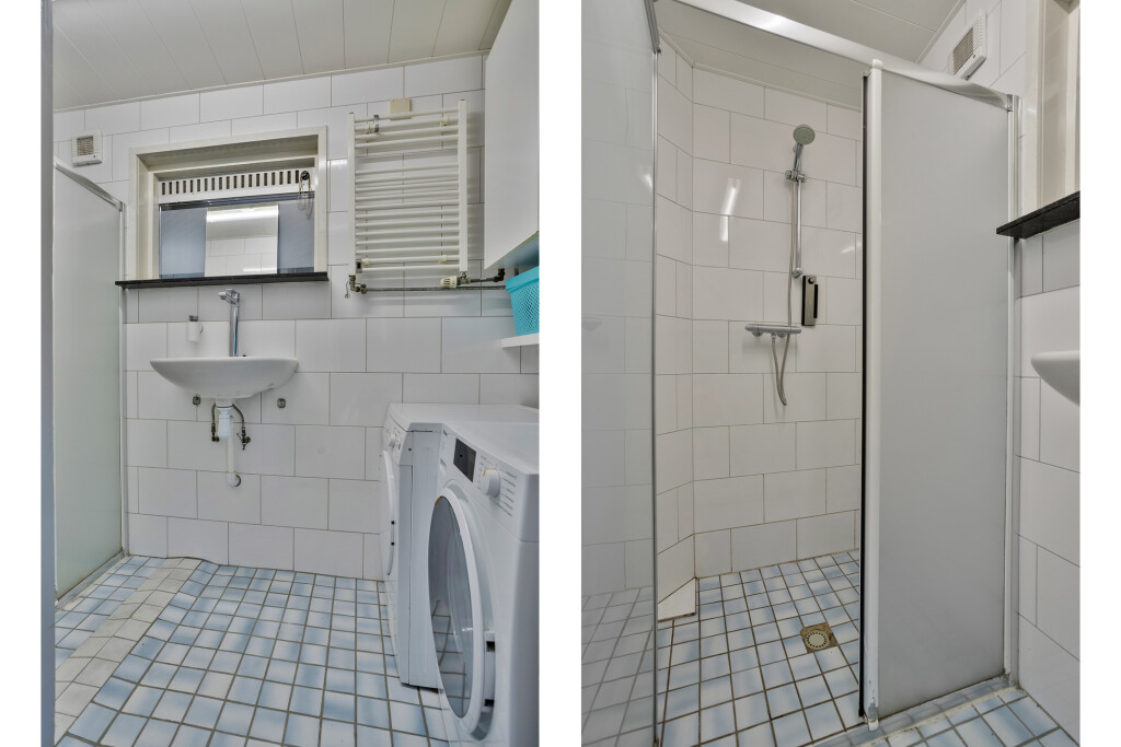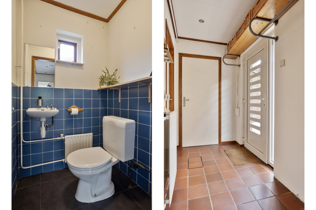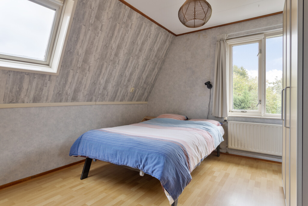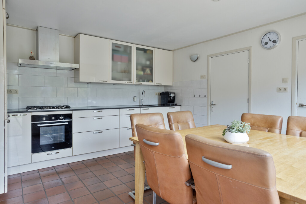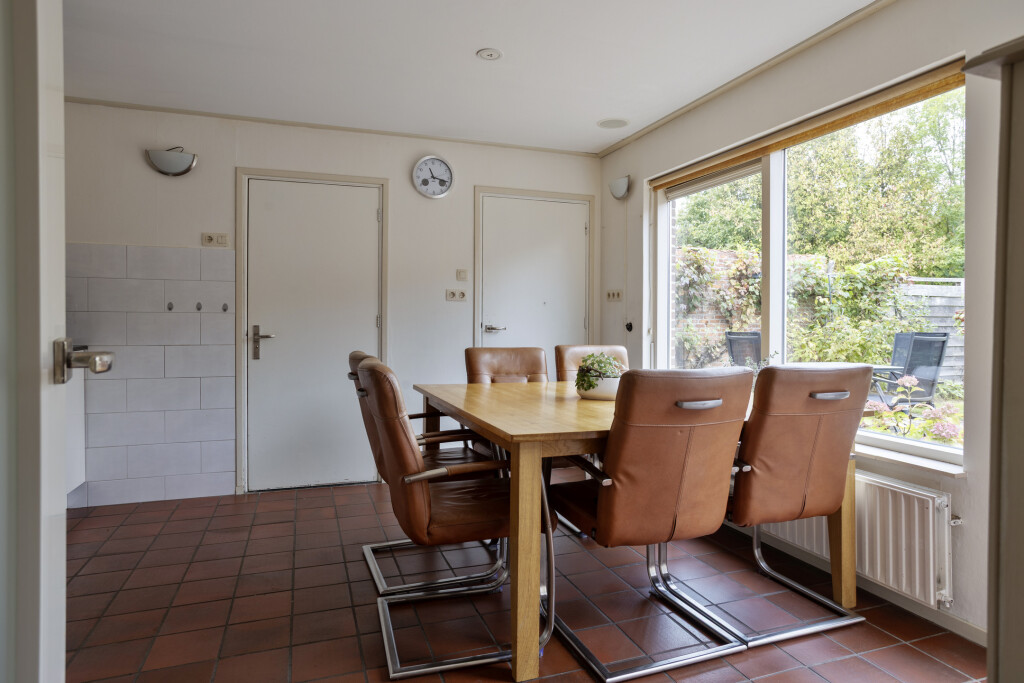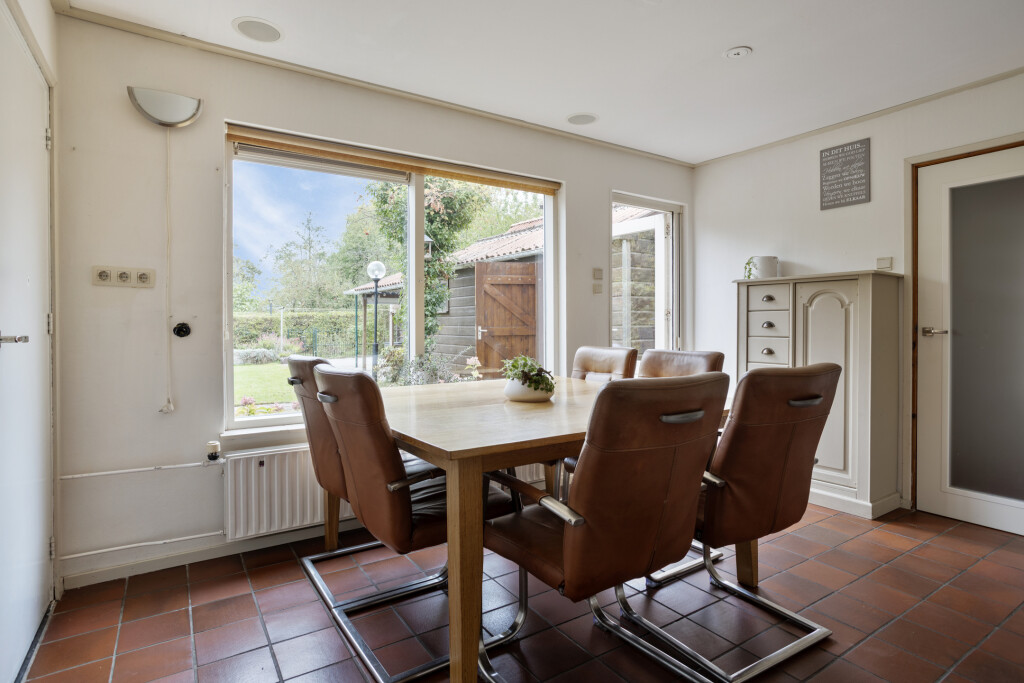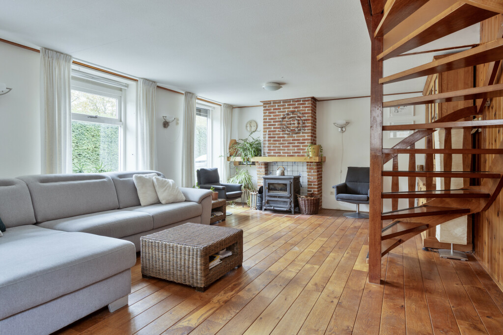 Bij binnenkomst tref je de hal met meterkast, toilet met fonteintje en toegang tot de keuken en woonkamer. De lichte woonkamer met gezellige haard nodigt uit om te ontspannen en geeft toegang tot de trap naar de verdieping. De woonkeuken is van alle gemakken voorzien met inbouwapparatuur, inclusief Quooker, en grote raampartijen die prachtig uitzicht geven op de tuin. Vanuit de keuken kom je bij de badkamer, uitgerust met douche, wastafel en witgoedaansluiting, en bij de provisiekast voor extra opbergruimte.