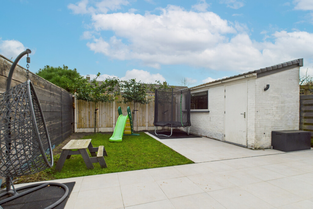 De achtertuin ligt op het zuiden en is onderhoudsvriendelijk aangelegd met een net gazon en een fijn terras direct aan de woning. Een vrijstaande stenen berging met witgoedaansluiting en elektra biedt veel praktische mogelijkheden, terwijl een vrije achterom de tuin eenvoudig bereikbaar maakt.