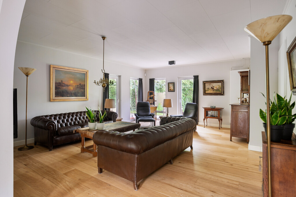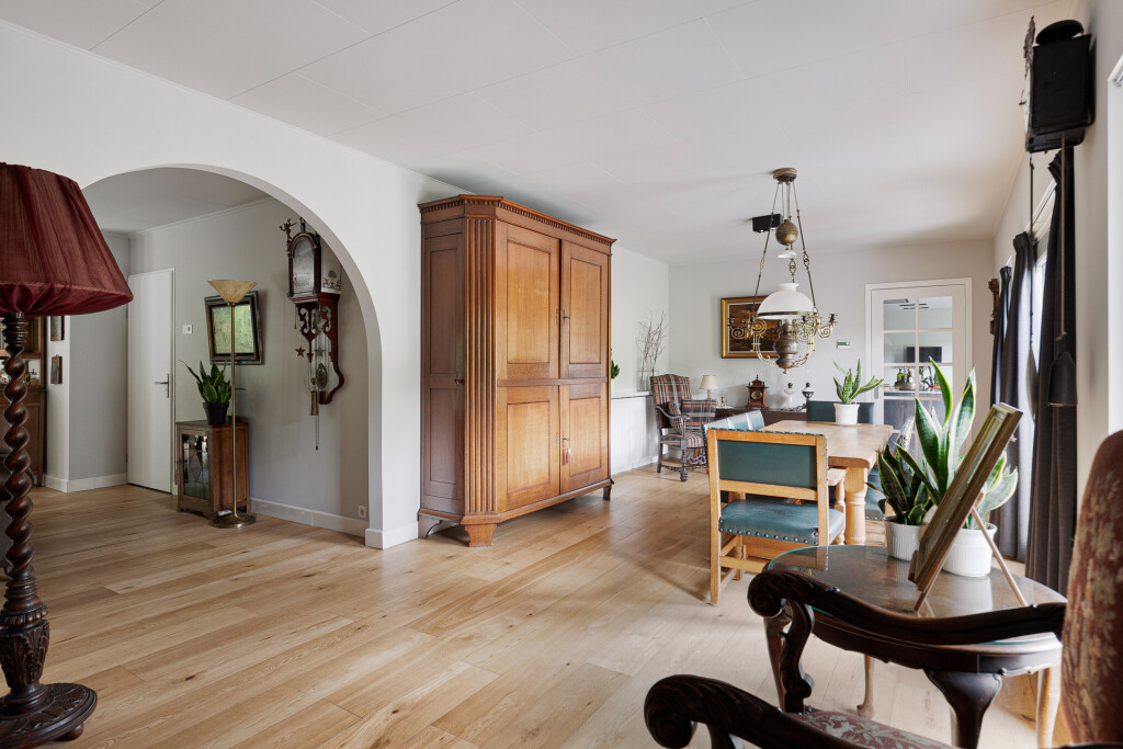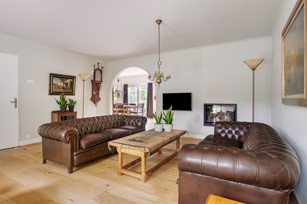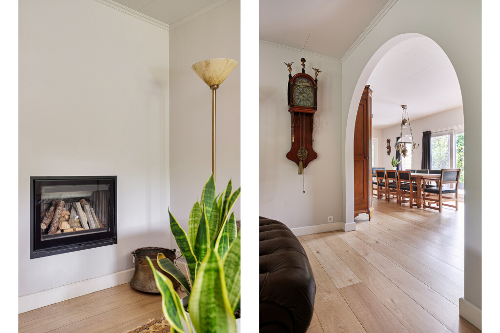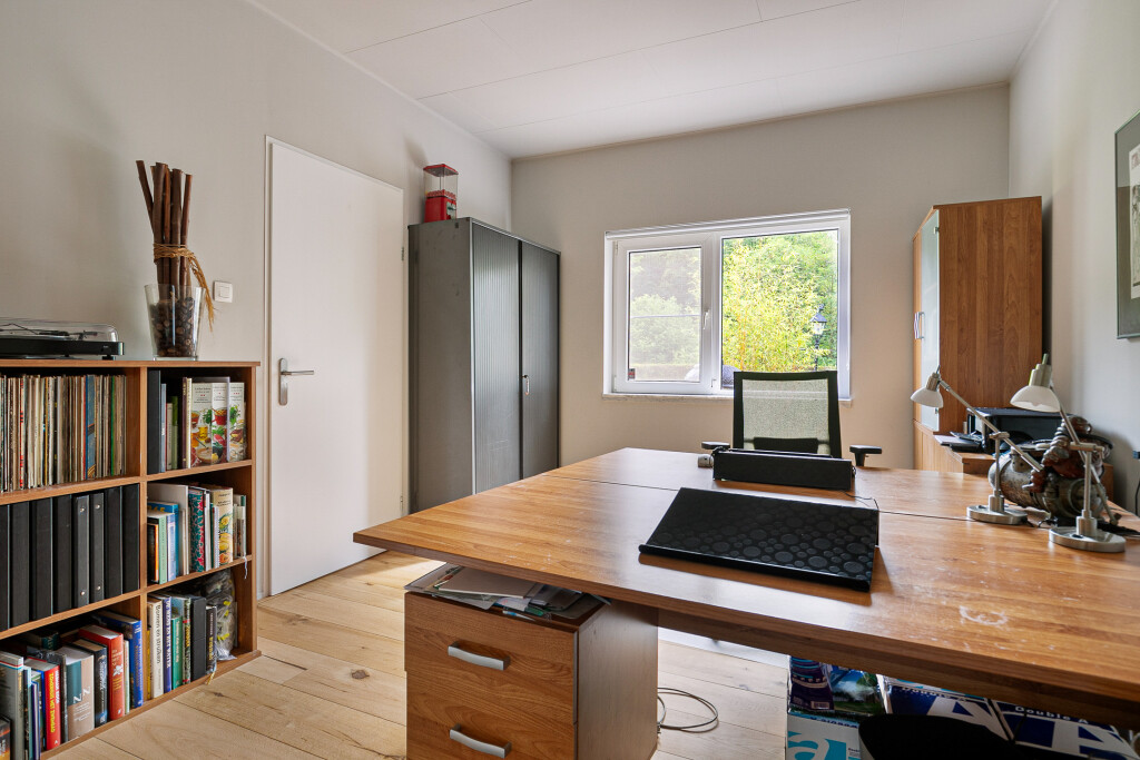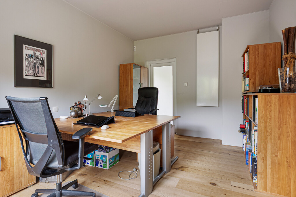 Entree in de fraaie ruime hal met tegelvloer, garderobe, uitgebreide meterkast, toilet en trapopgang. Zeer ruime living met grote raampartijen en een nieuwe houthaard (’21). Aansluitend een eetkamer vanwaar je heerlijk de tuin in kijkt. Via een schuifpui is er toegang tot het terras. Deur naar een ruim kantoor met eigen toegang via de zijkant van de woning.