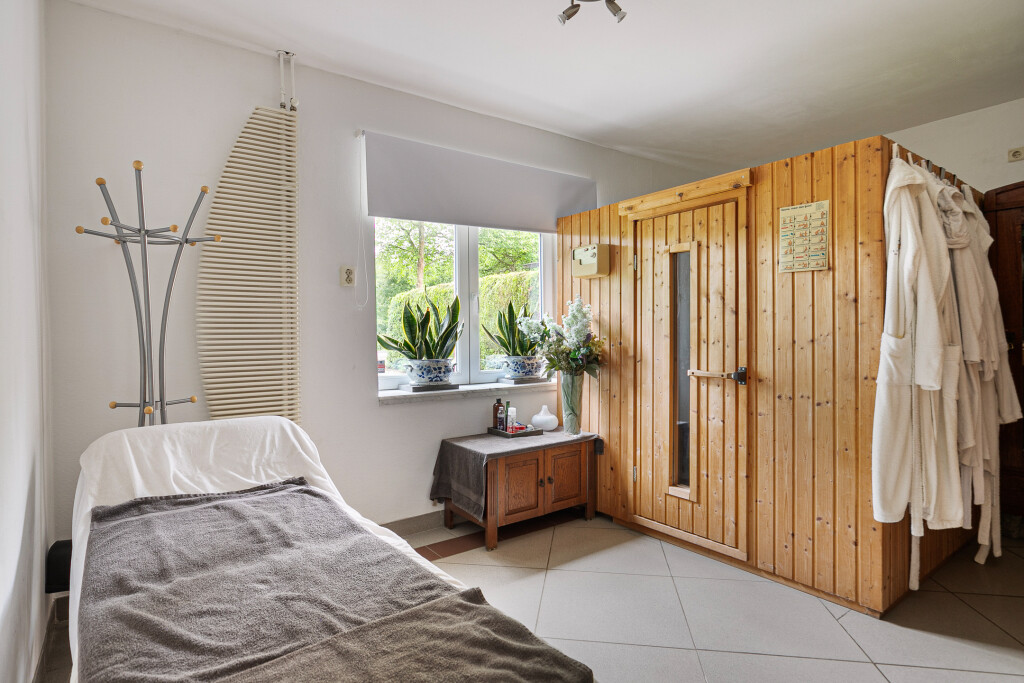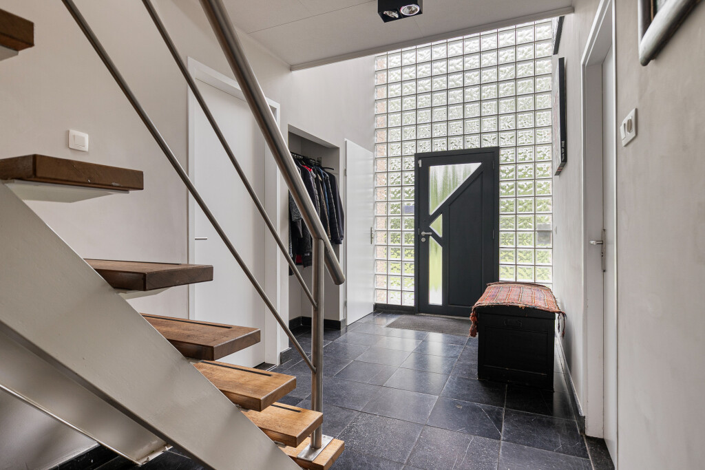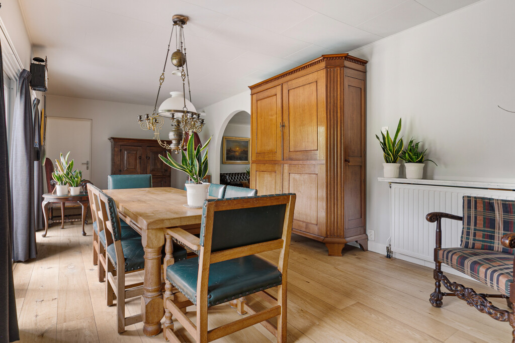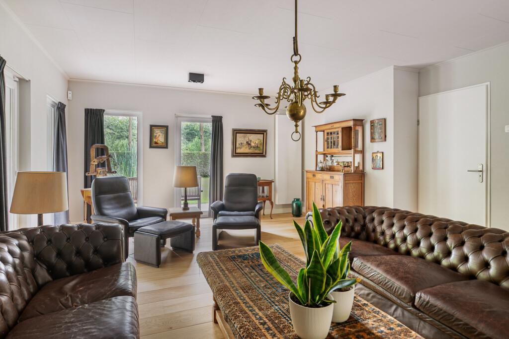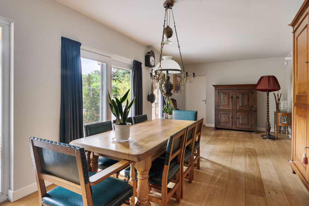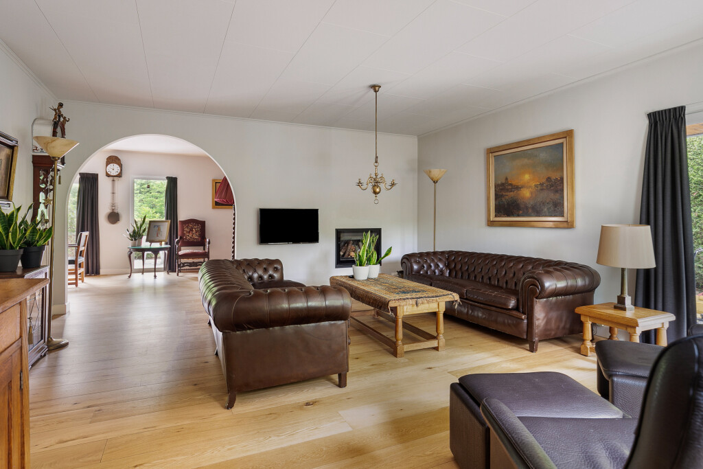 Entree in de fraaie ruime hal met tegelvloer, garderobe, uitgebreide meterkast, toilet en trapopgang. Zeer ruime living met grote raampartijen en een nieuwe houthaard (’21). Aansluitend een eetkamer vanwaar je heerlijk de tuin in kijkt. Via een schuifpui is er toegang tot het terras. Deur naar een ruim kantoor met eigen toegang via de zijkant van de woning.