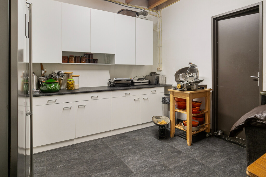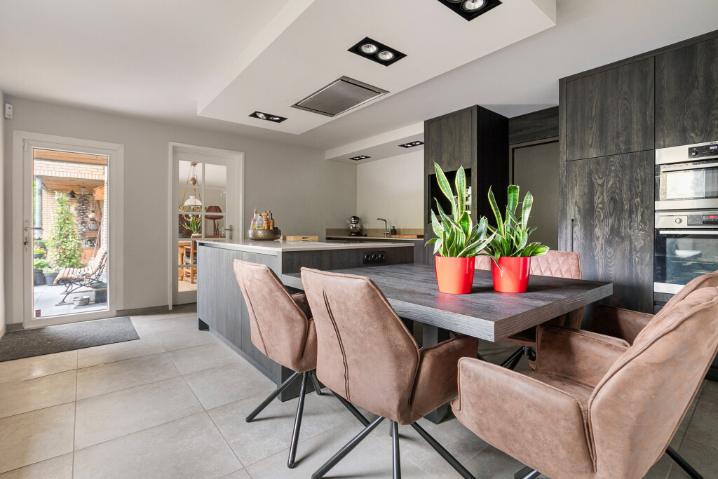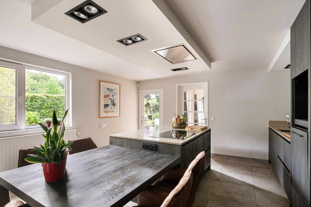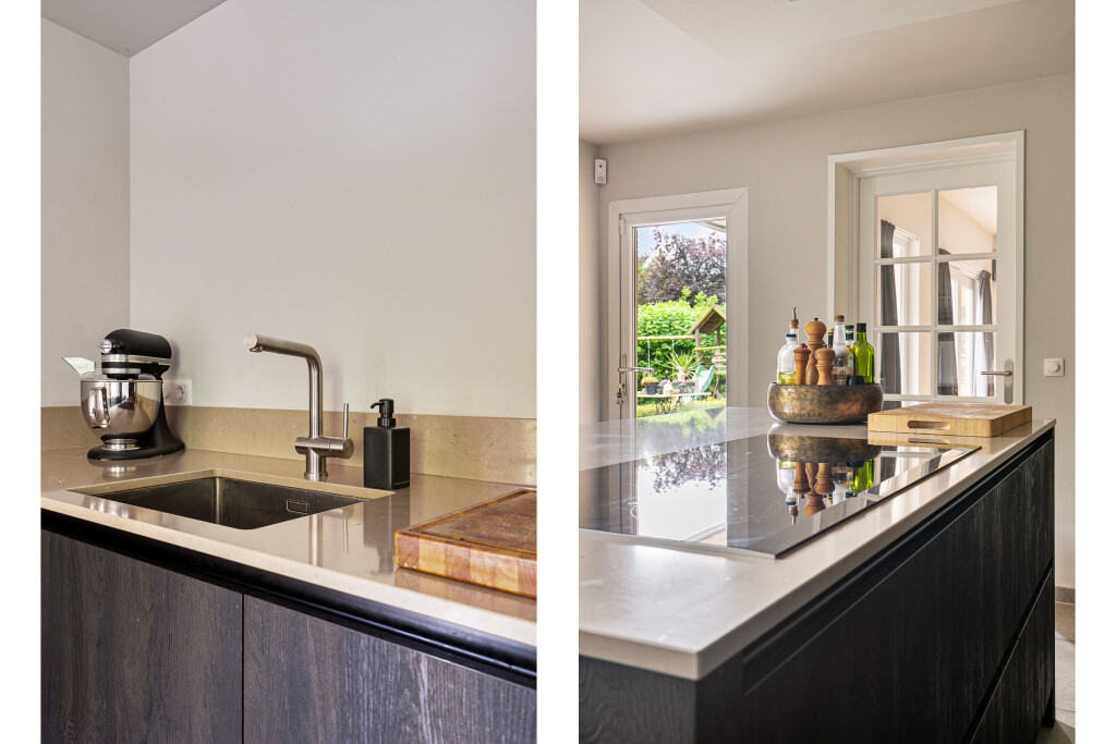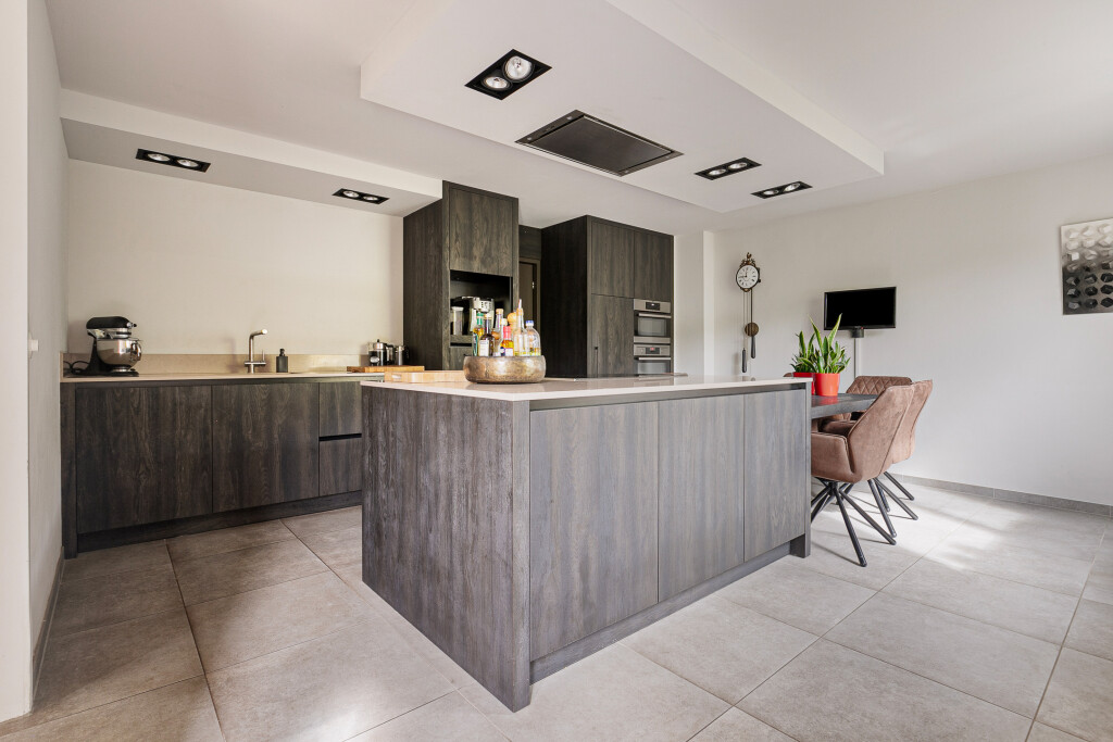 De nieuwe leefkeuken is modern met een kookeiland. Het kookeiland is voorzien van een inductie kookplaat met afzuigkap. Verder heeft de keuken een grote kastenwand voorzien van een vaatwasser, oven en combi/oven. Via de keuken is er een deur naar een ruime bijkeuken. De garage (voorzien van elektrische deur) is nu opgedeeld in een berging aan de voorzijde en een ruime bijkeuken aan de achterzijde.