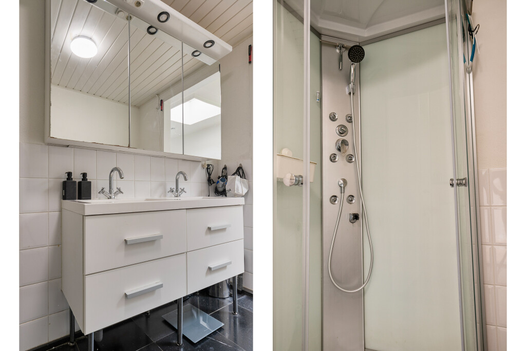 De nette badkamer heeft een wasmeubel met dubbele wastafel, douchecabine en toilet. Verder is er nog een aparte wasruimte met de aansluiting voor de wasapparatuur.