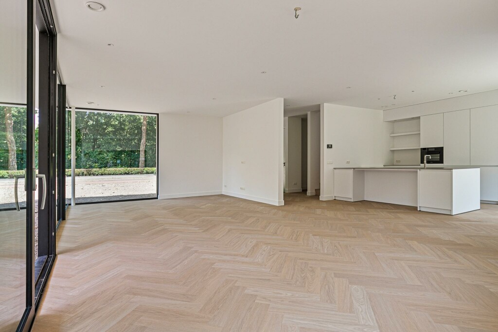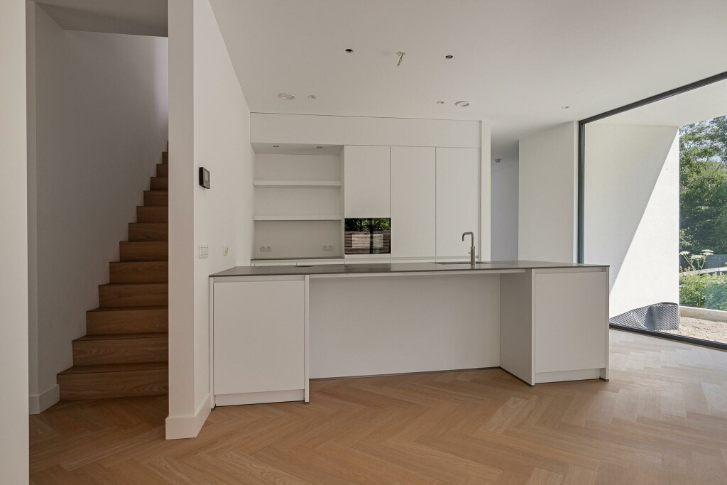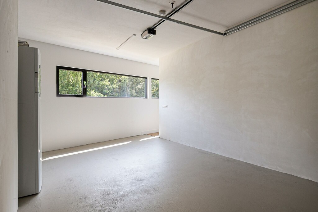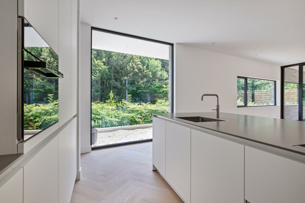Entree in de ruime hal met uitgebreide meterkast, toilet en trapkast. De riante woonkamer is heerlijk licht door de grote raampartijen en heeft prachtig zicht op de tuin en het bos. Vanuit de woonkamer is er een grote schuifpui die toegang biedt tot een overdekt terras aan de woning. De ruime open keuken heeft een rechte opstelling met kookeiland. De keuken is voorzien van een inductie kookplaat met ingebouwde afzuiging (Bora), Quooker kraan, vaatwasmachine (Miele) en combi-stoomoven (Miele). Vanuit de keuken kom je in een ruime bijkeuken met deur naar de tuin. Vanuit de bijkeuken is er toegang tot de garage met de warmtepomp installatie. De garage heeft een elektrische roldeur en een deur naar de zijkant van de woning.