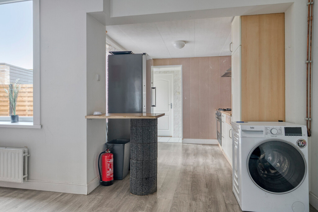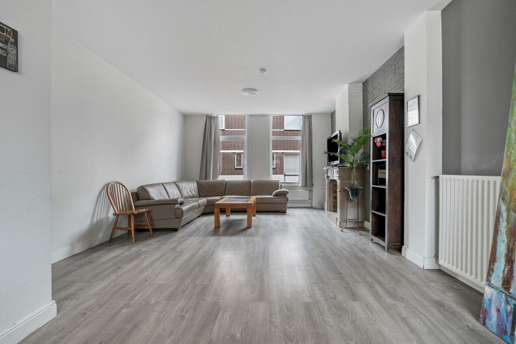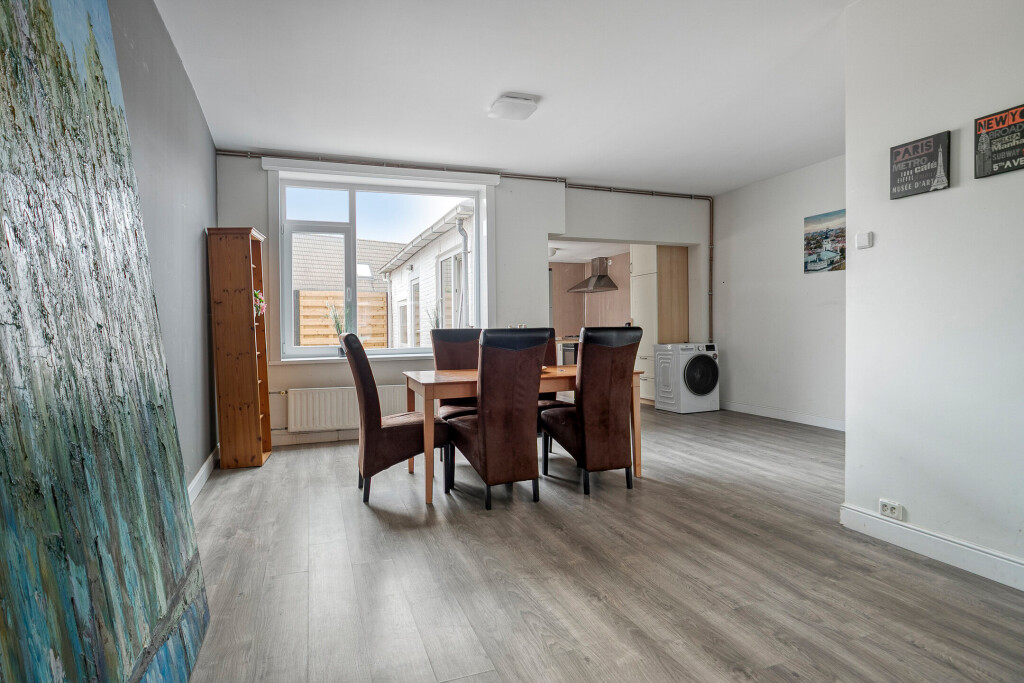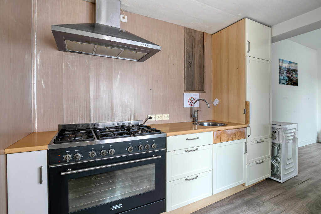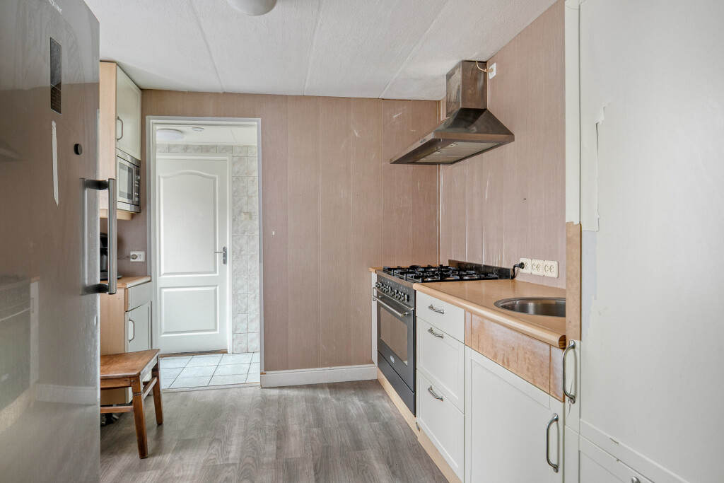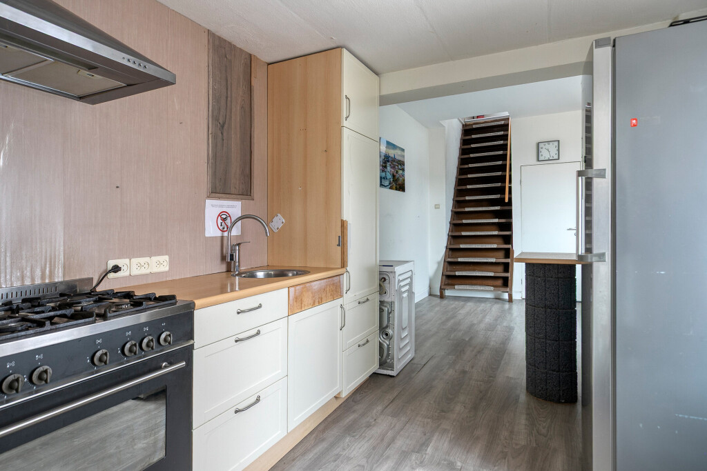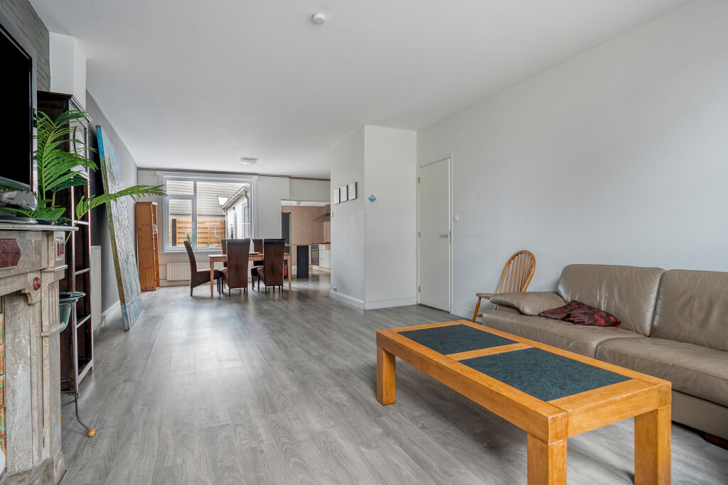 De lichte woonkamer strekt zich uit over de gehele diepte van de woning en biedt volop ruimte voor een gezellige zithoek én een riante eethoek. Dankzij de grote ramen komt er veel daglicht binnen. De open keuken sluit hier mooi op aan. Hoewel de keuken wat gedateerd is, kun je er met een moderne update een sfeervol hart van het huis van maken.