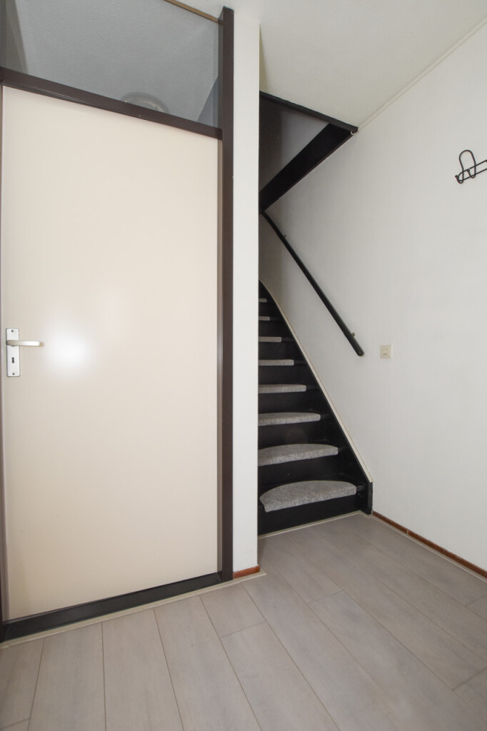 Entree in de hal met toilet, meterkast en trapopgang. De diepe, lichte woonkamer heeft een laminaatvloer en een handige trapkast. De halfopen keuken is eenvoudig en is voorzien van een los kooktoestel. Vanuit de keuken een deur naar de tuin.