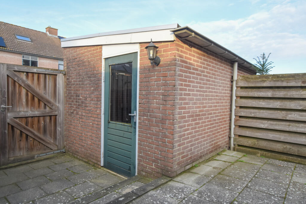 Nette, diepe, onderhoudsvriendelijke achtertuin met stenen berging en achterom.