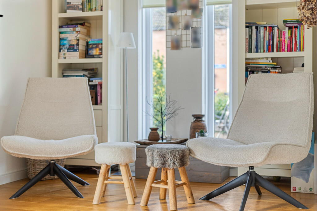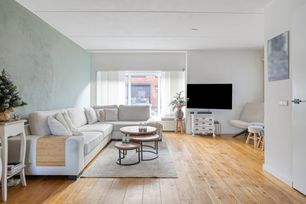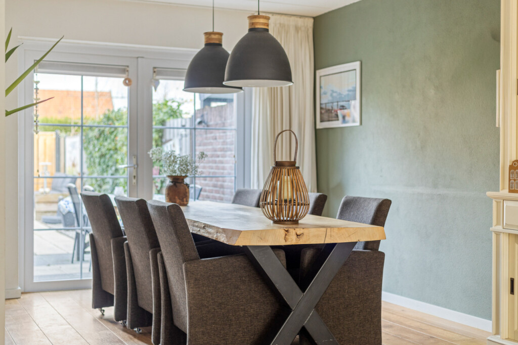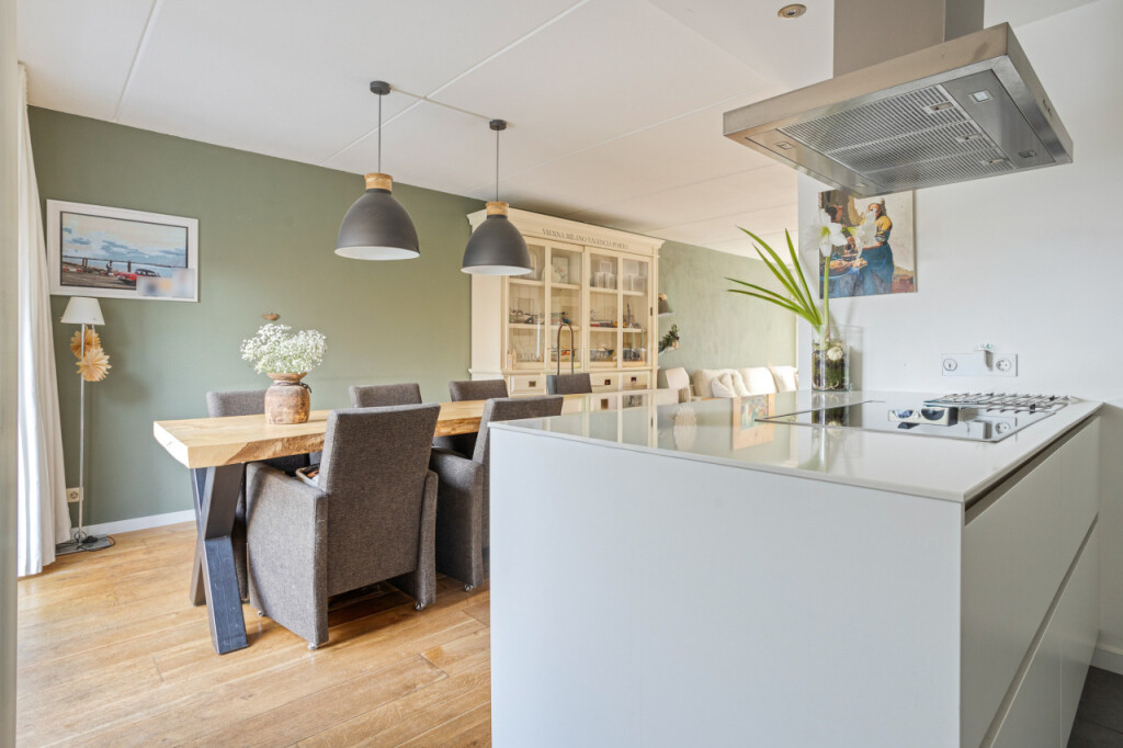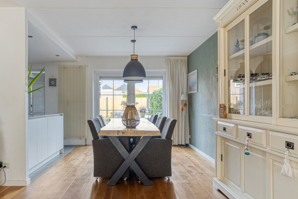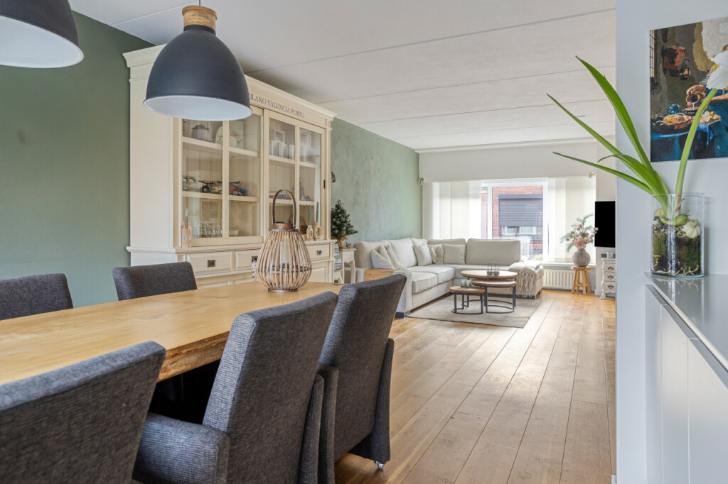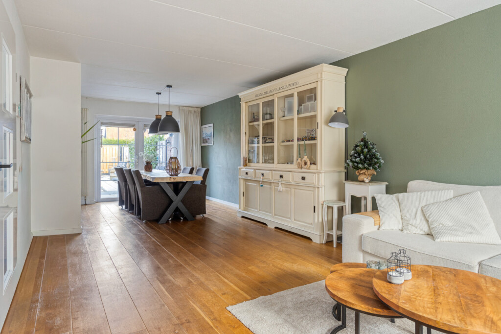De woonkamer straalt warmte en gezelligheid uit. De grote ramen zorgen voor een overvloed aan natuurlijk licht, terwijl de doorlopende houten vloer een fijne, rustige basis vormt. Het ruime zitgedeelte aan de voorzijde en de royale eethoek aan de tuinzijde maken dit een heerlijke plek om samen te zijn; of dat nu is voor een ontspannen avond, een verjaardag of een etentje met familie.