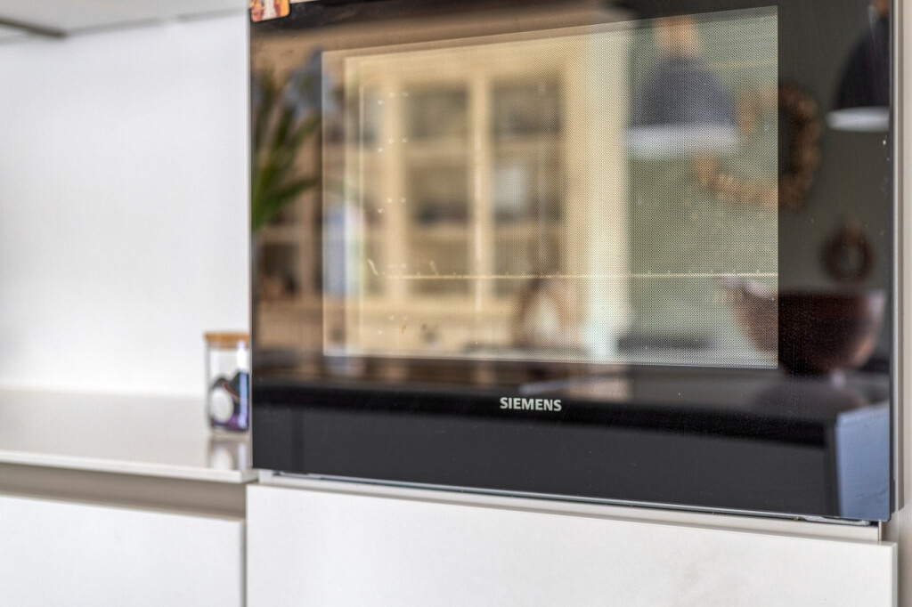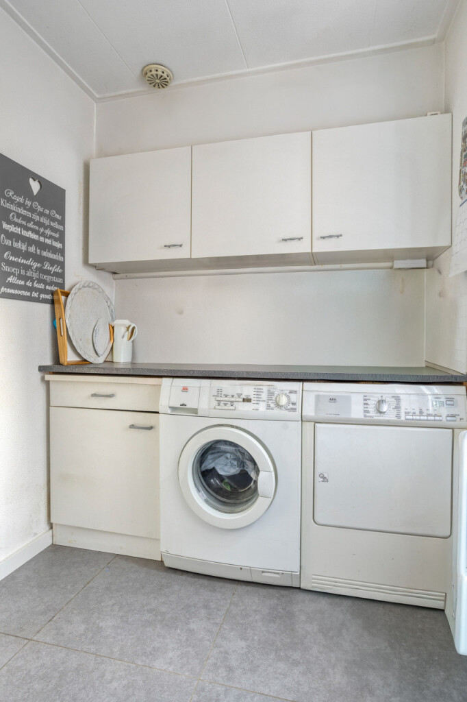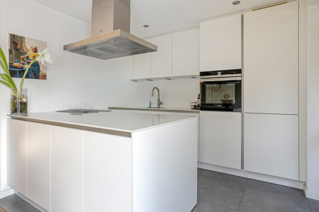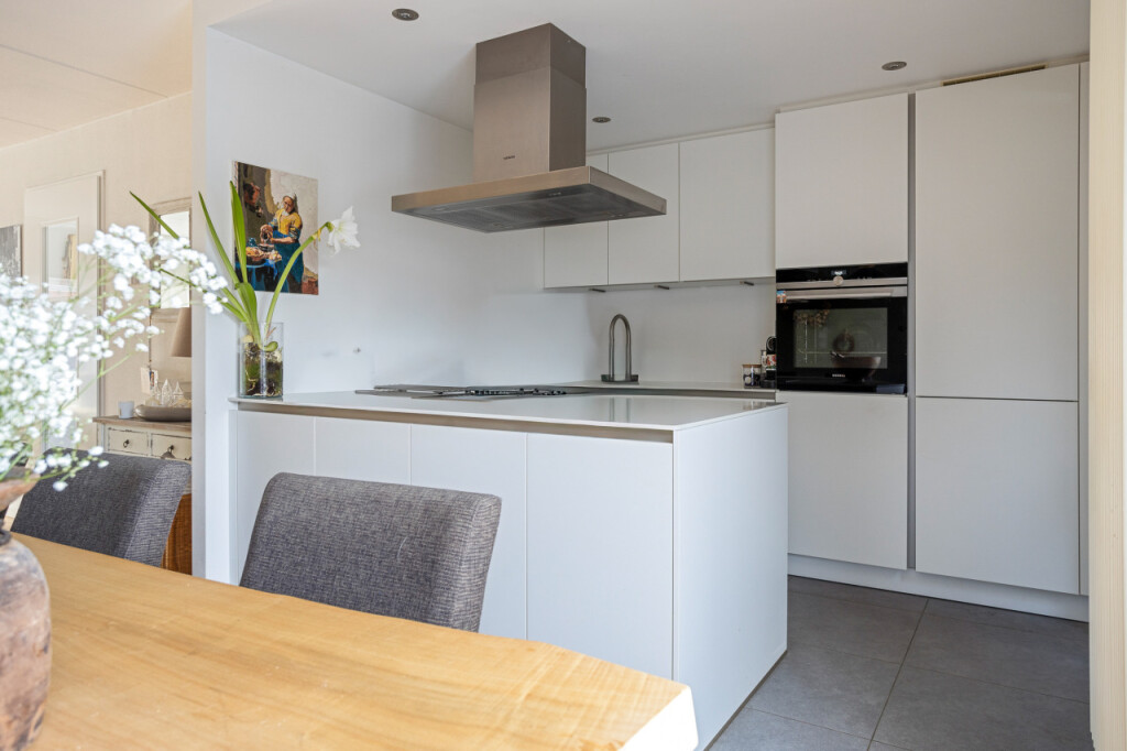 De moderne open keuken heeft een frisse en tijdloze uitstraling en biedt volop werk- en opbergruimte. Dankzij de open verbinding met de eetkamer blijf je altijd betrokken bij wat er in huis gebeurt. Aangrenzend ligt de handige bijkeuken, ideaal voor extra voorraad, wasmachine en droger én een directe doorgang naar de garage. De royale garage biedt daarnaast ruimte voor auto, fietsen, hobby of klusprojecten.