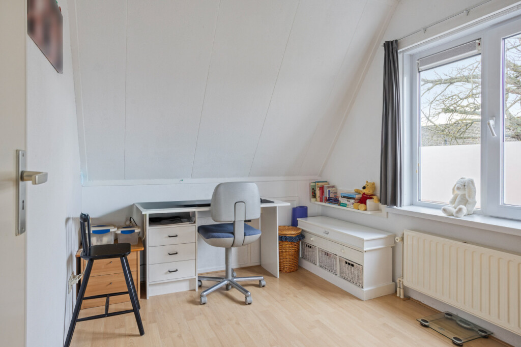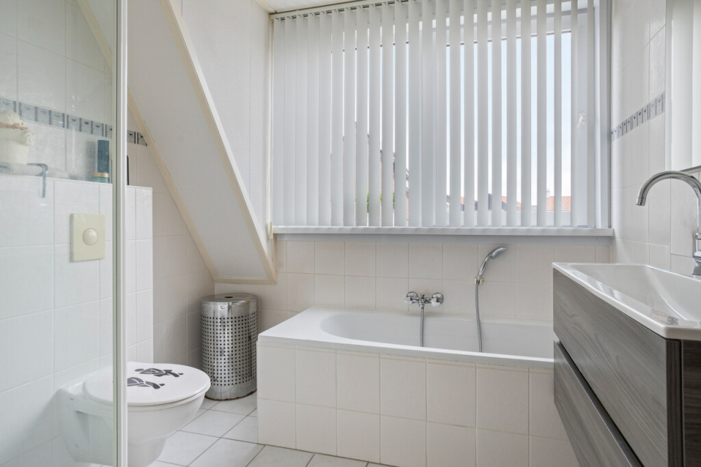 Op de eerste verdieping bevinden zich drie comfortabele slaapkamers, allemaal licht en ruim van opzet. De badkamer is netjes uitgevoerd en beschikt over een ligbad, wastafelmeubel en toilet; perfect voor een gezin. Via de vaste trap kom je op de tweede verdieping: een grote, open zolder die eenvoudig kan worden ingericht als vierde slaapkamer, werkplek of speelzolder.