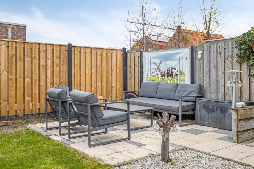 Heerlijke tuin met zowel grenzend aan de woning als achterin de tuin een fijn terras. De tuin is omgeven door een nieuwe schutting. Verder is er in de tuin een handige houten berging, toegang tot de garage en een achterom.
