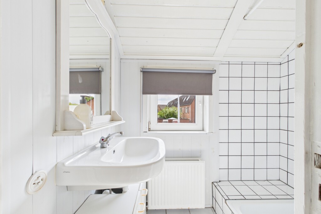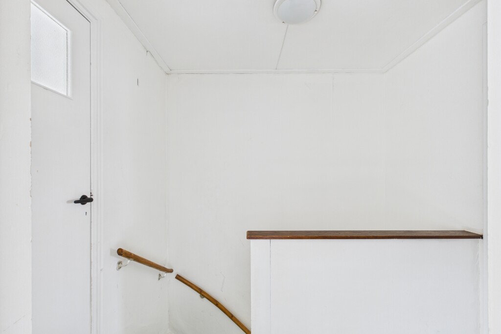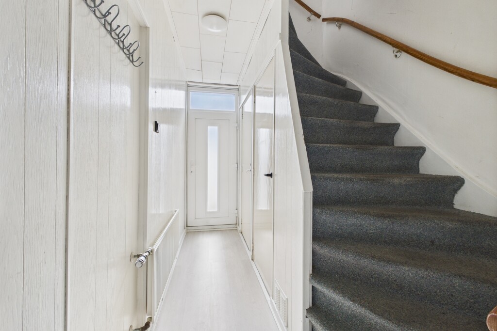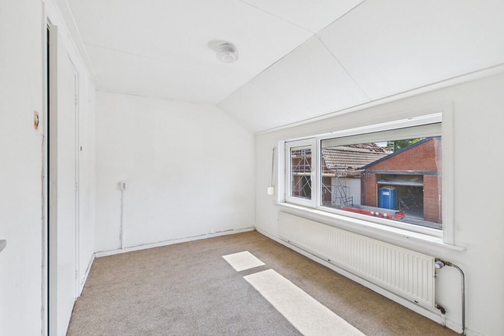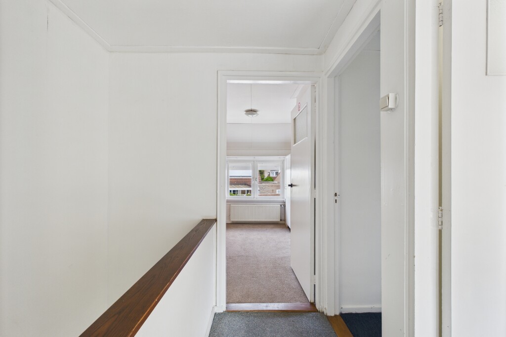 Overloop met toegang tot de 3 slaapkamers, welke zijn voorzien van een handige vaste kast. De grote slaapkamer aan de achterzijde heeft tevens een luik naar de bergzolder. De badkamer is compact maar functioneel, met een douche en een wastafel.