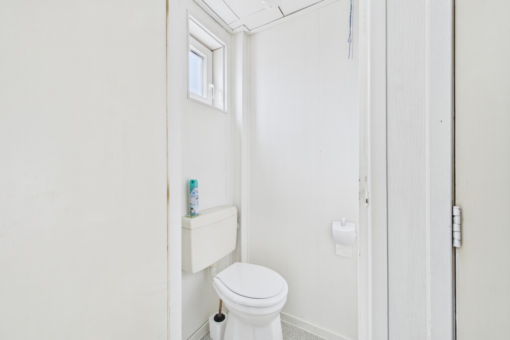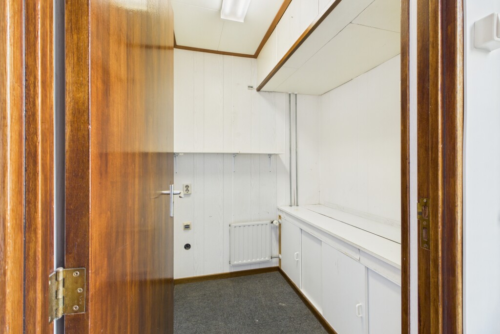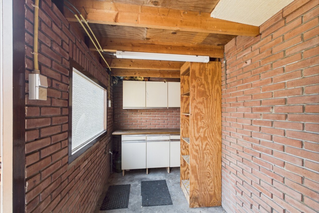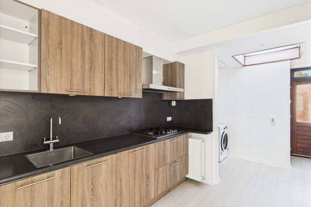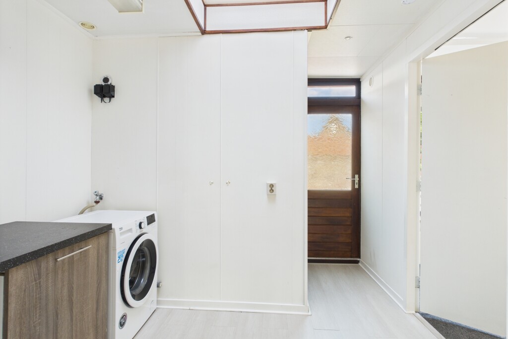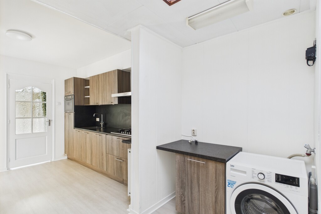 Lichte hal met toilet, trapkast, trap naar de verdieping en toegang tot de keuken. De halfopen keuken is voorzien van een gaskookplaat, afzuigkap, combimagnetron, vriezer, vaatwasser en een koelkast. Achterin de keuken vind je nog ruimte voor de wasmachine/droger en is er een praktische berging. Naast de keuken is er de lichte woonkamer. Met een lichte scheidingswand is er achter de woonkamer een hobby-/werkkamer gemaakt, maar deze kun je eenvoudig weer verwijderen om een echte doorzonkamer te creëren.