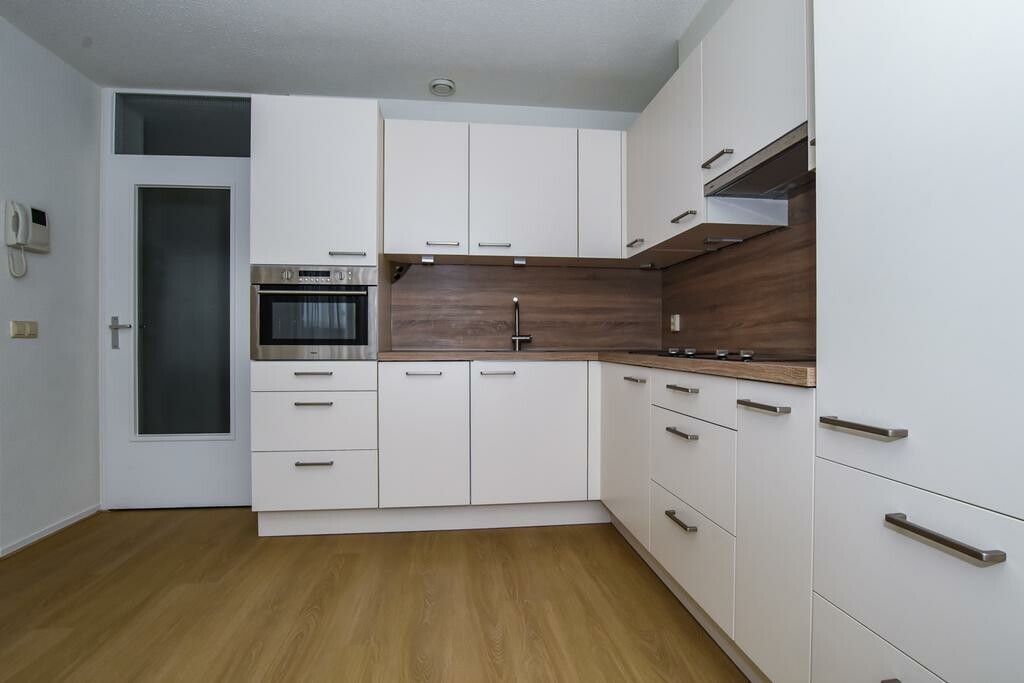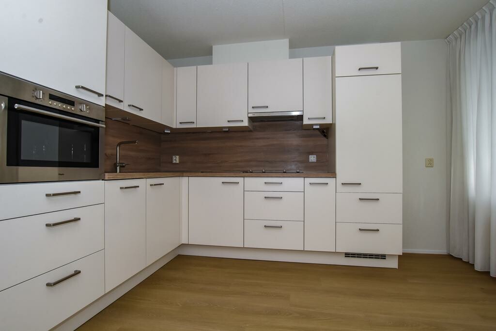 De nieuwe open keuken heeft een hoekopstelling en is voorzien van een kookplaat, afzuigkap, koelkast, combi-oven en vaatwasser.