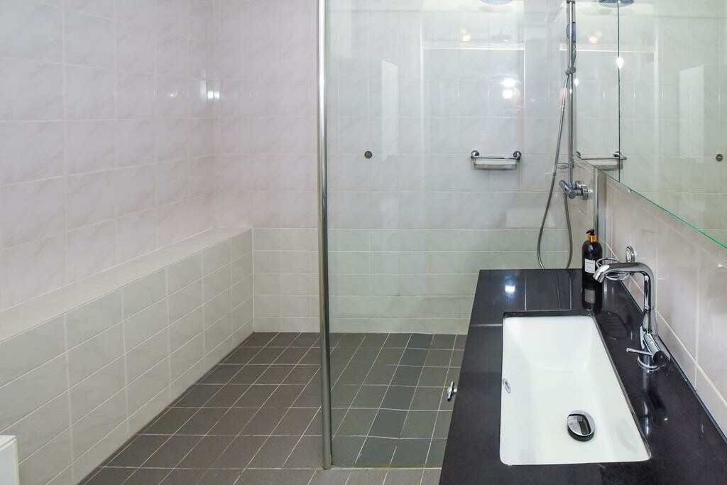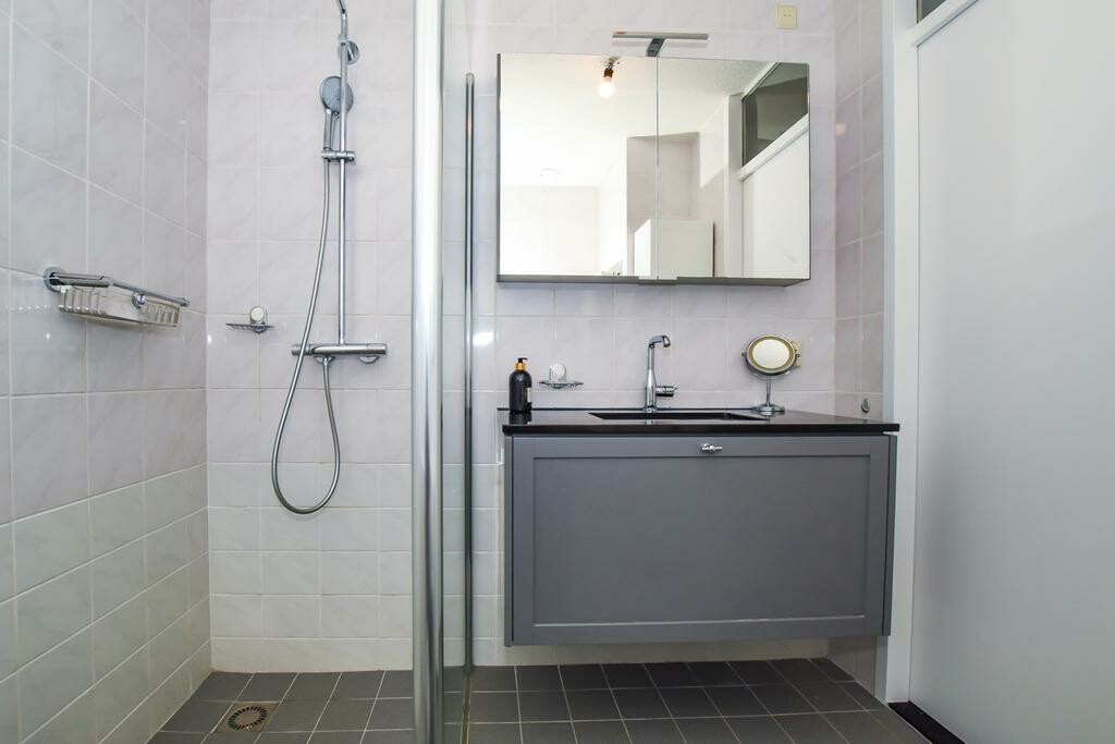 Aan de achterzijde van het appartement een ruime- en een middelgrote slaapkamer. De nette badkamer heeft een wasmeubel en een ruime inloopdouche.