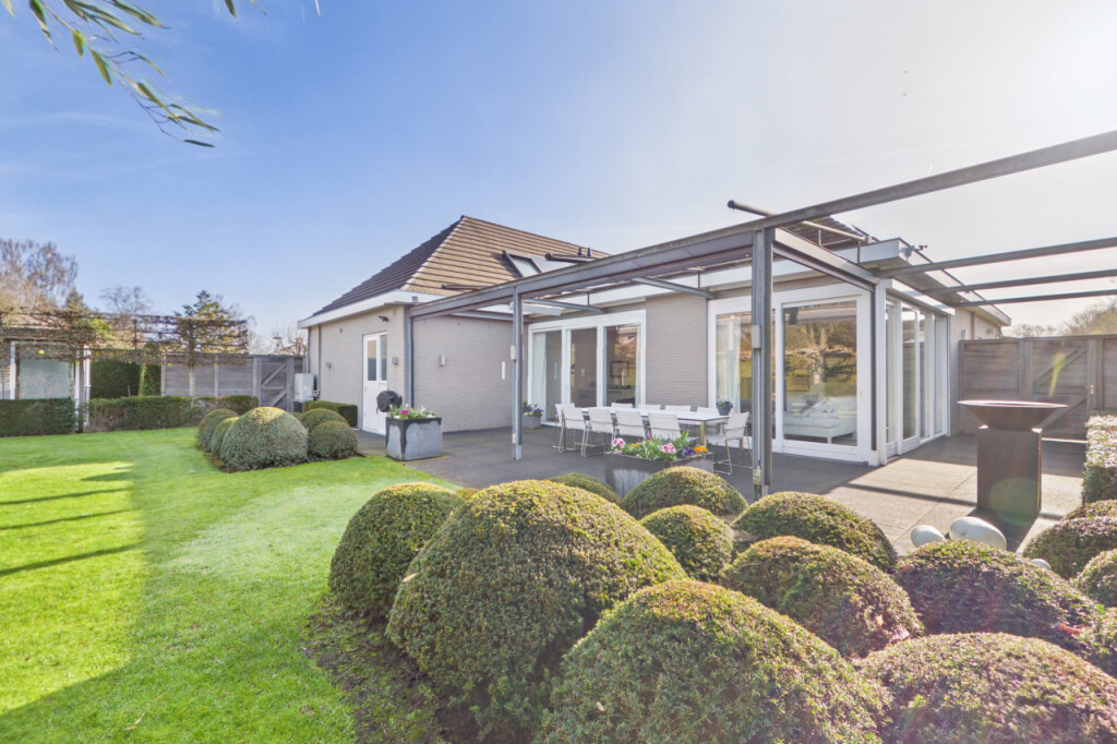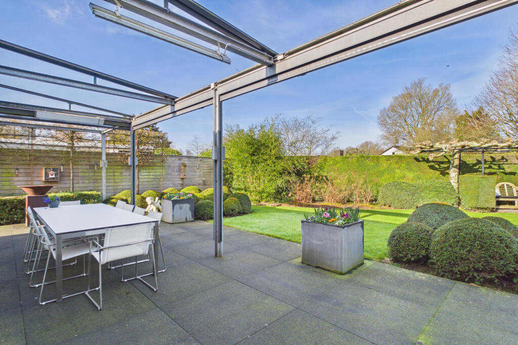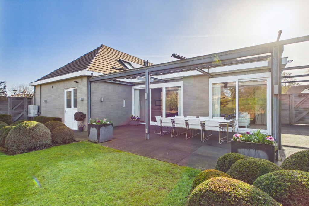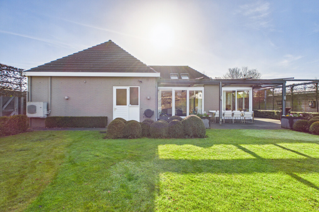 Rondom de woning ligt een fraai aangelegde tuin die veel privacy en ruimte biedt. De tuin is verzorgd aangelegd met volgroeide hagen en een groot gazon. De tuin is daarnaast volledig voorzien van sfeerverlichting, waardoor ook in de avond een warme en bijzondere sfeer ontstaat. Achter de woning bevindt zich een groot terras waar je heerlijk kunt genieten van het buitenleven. Het terras is bovendien uitgerust met screens en heaters onder de overkapping, waardoor het terras grotendeels kan worden afgesloten. Hierdoor ontstaat een lang buitenseizoen en kun je tot laat in het jaar en tot in de avonduren comfortabel buiten genieten.