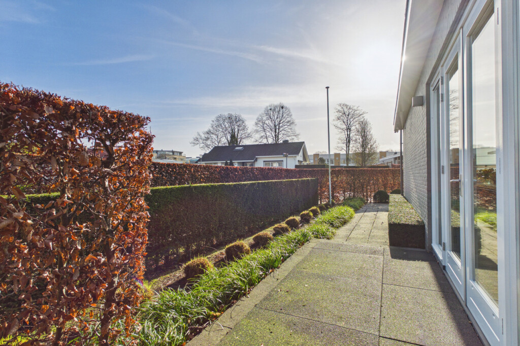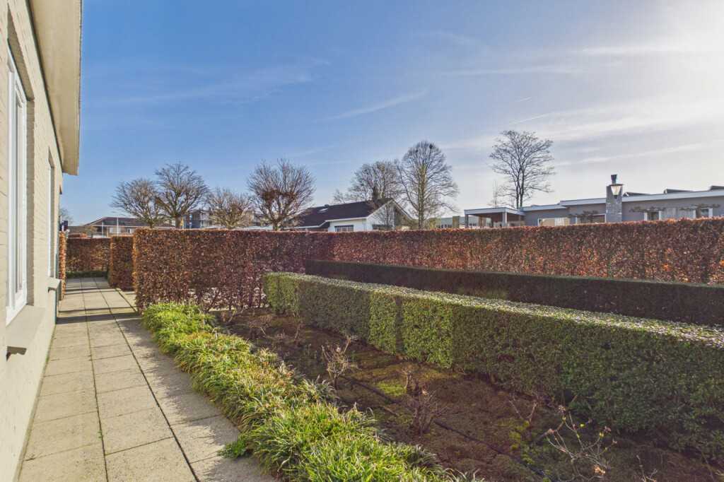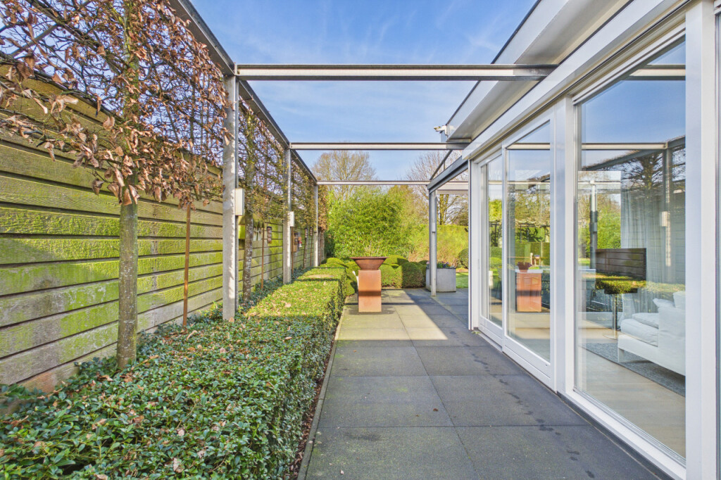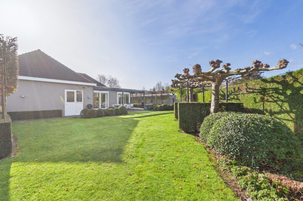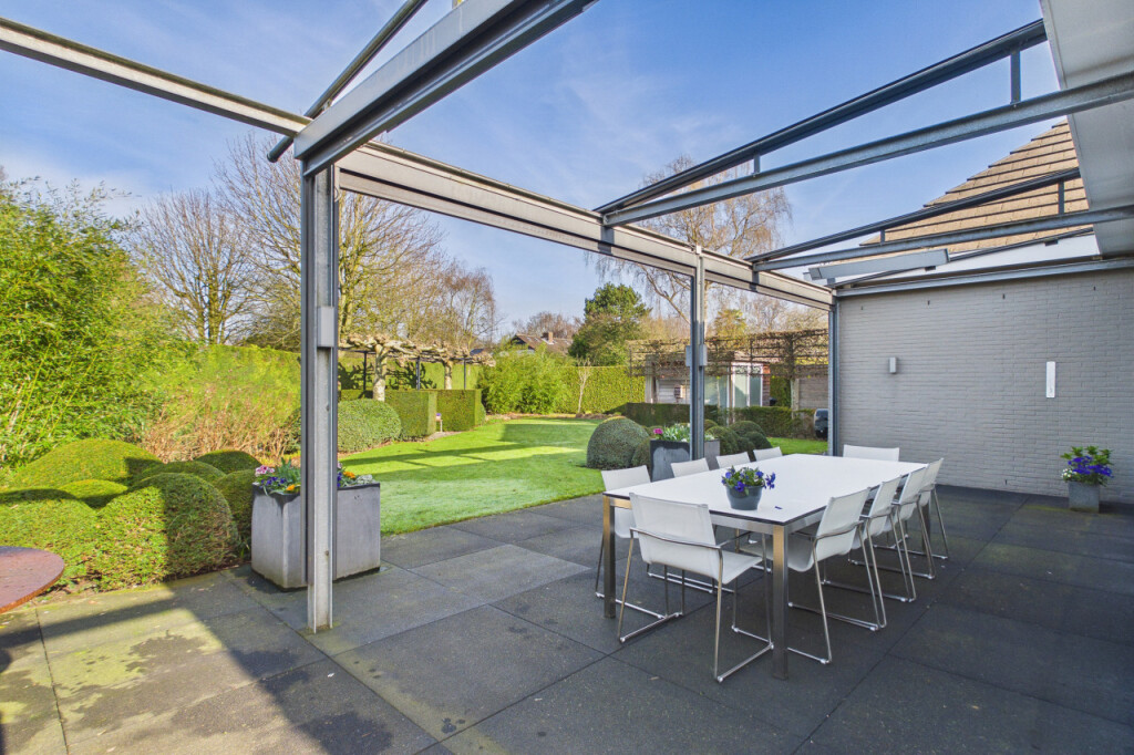 Rondom de woning ligt een fraai aangelegde tuin die veel privacy en ruimte biedt. De tuin is verzorgd aangelegd met volgroeide hagen en een groot gazon. De tuin is daarnaast volledig voorzien van sfeerverlichting, waardoor ook in de avond een warme en bijzondere sfeer ontstaat. Achter de woning bevindt zich een groot terras waar je heerlijk kunt genieten van het buitenleven. Het terras is bovendien uitgerust met screens en heaters onder de overkapping, waardoor het terras grotendeels kan worden afgesloten. Hierdoor ontstaat een lang buitenseizoen en kun je tot laat in het jaar en tot in de avonduren comfortabel buiten genieten.