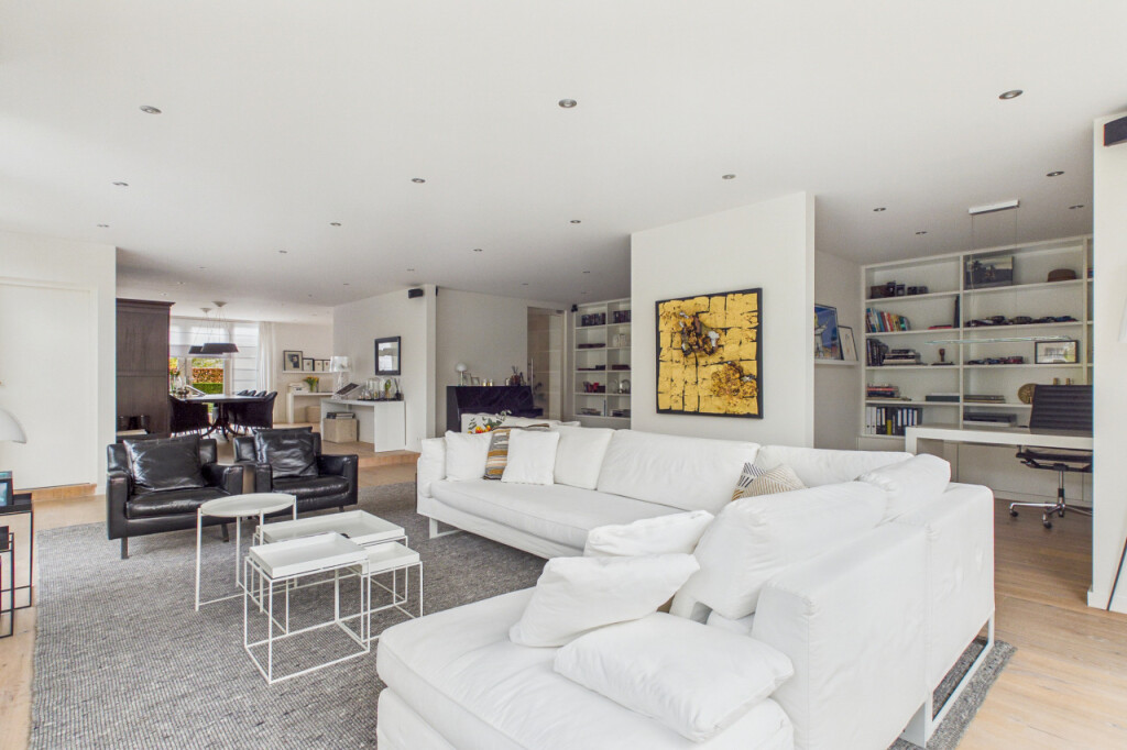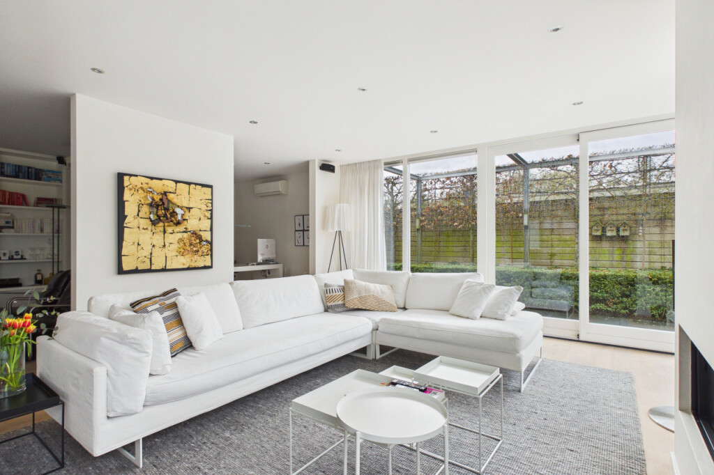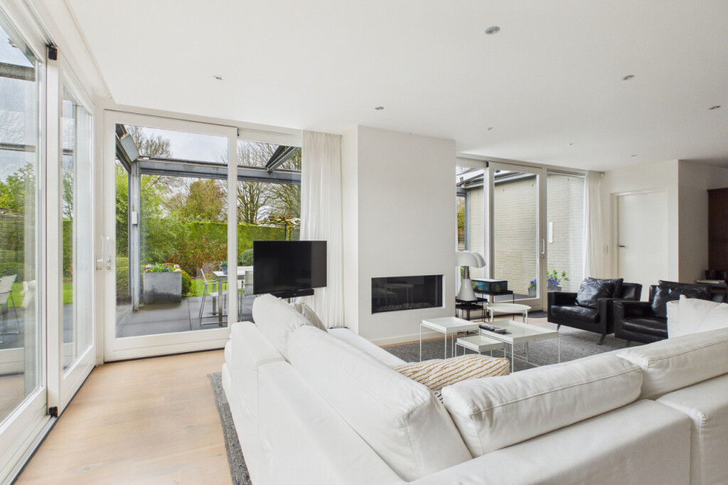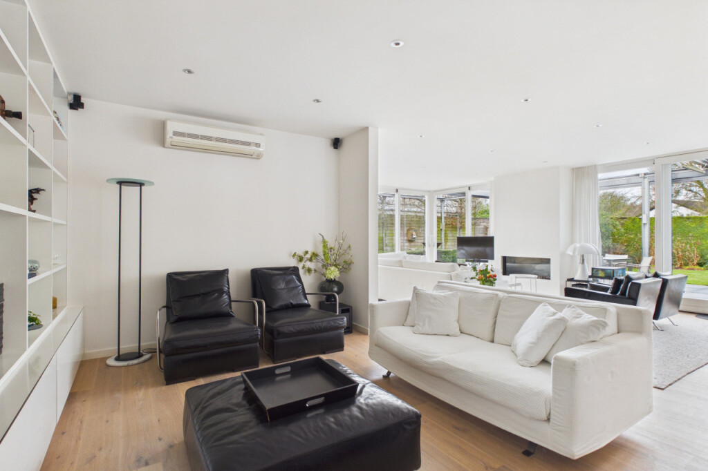 Wat direct opvalt zodra je binnenkomt, is de ruimte en het licht. Door de uitbreidingen is er een royale en open leefomgeving ontstaan, waarin verschillende woonfuncties op natuurlijke wijze samenkomen. De woonruimte op de begane grond bestaat uit meerdere comfortabele zones. Zo is er een bibliotheekruimte met tv-aansluiting, een royale zithoek in de woonkamer voorzien van een gaskachel en een kantoorruimte met uitzicht op de tuin die ideaal is voor thuiswerken. Daarnaast bevindt zich direct naast de voordeur een extra kamer op de begane grond. Deze ruimte is zeer geschikt als praktijkruimte, kantoor aan huis of studeerkamer, maar kan ook uitstekend worden gebruikt voor het langer ontvangen van gasten. De woonkamer is een heerlijke plek met grote raampartijen, twee schuifpuien naar de tuin op het zuiden. en verschillende comfortabele zithoeken. Op zonnige dagen kunnen beide puien volledig worden geopend waardoor binnen en buiten naadloos in elkaar overlopen. In de zomer kan de woning zo letterlijk naar de tuin worden geopend. Vanuit de zithoek kijk je uit op het groen rondom de woning en loopt de woonkamer naadloos over in de open eetkamer.