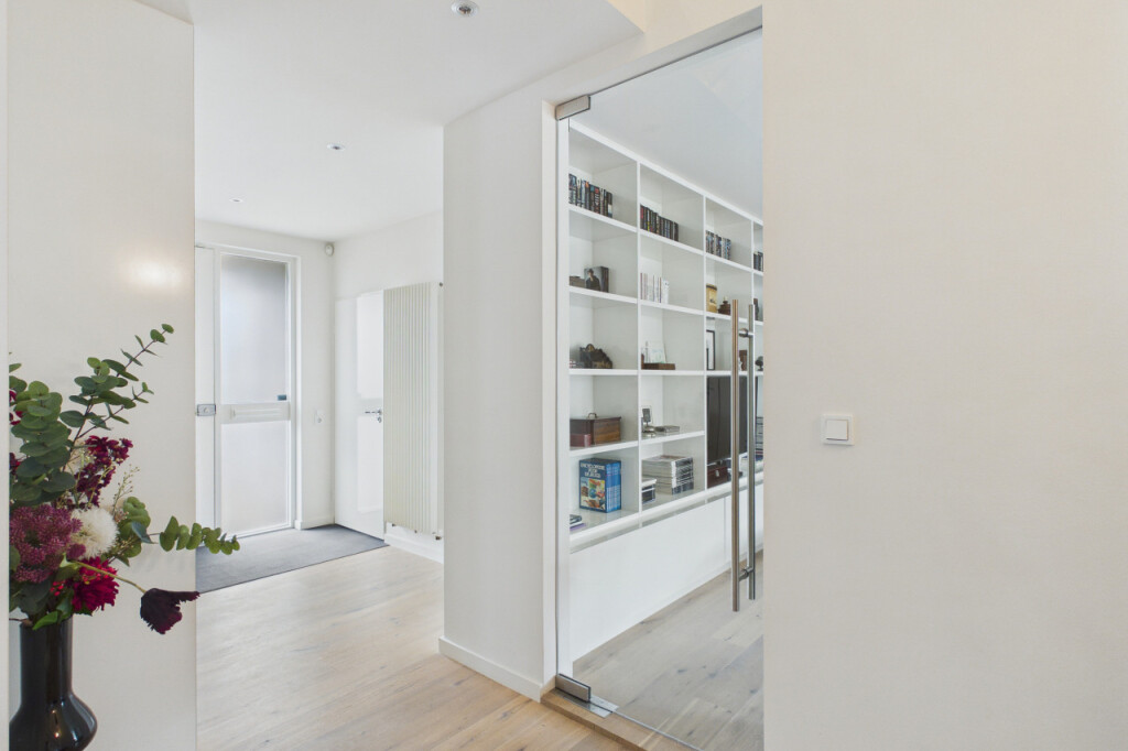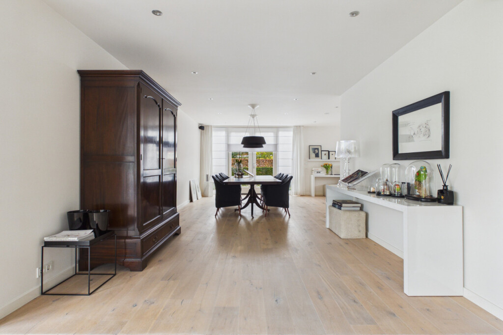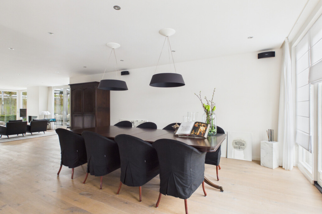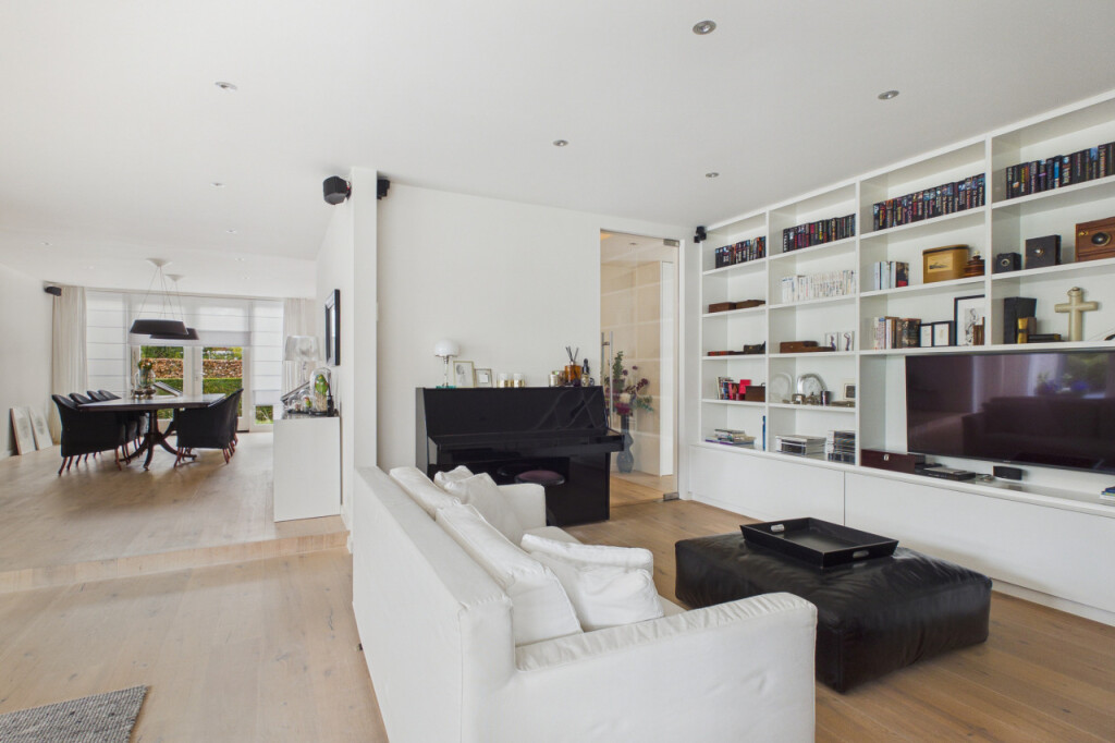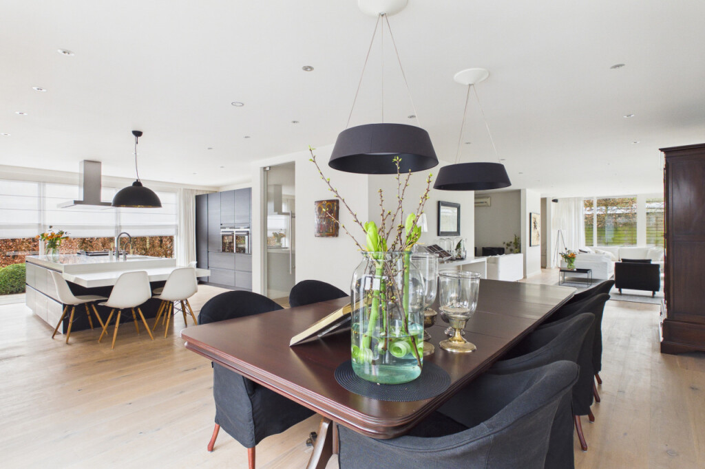 Wat direct opvalt zodra je binnenkomt, is de ruimte en het licht. Door de uitbreidingen is er een royale en open leefomgeving ontstaan, waarin verschillende woonfuncties op natuurlijke wijze samenkomen. De woonruimte op de begane grond bestaat uit meerdere comfortabele zones. Zo is er een bibliotheekruimte met tv-aansluiting, een royale zithoek in de woonkamer voorzien van een gaskachel en een kantoorruimte met uitzicht op de tuin die ideaal is voor thuiswerken. Daarnaast bevindt zich direct naast de voordeur een extra kamer op de begane grond. Deze ruimte is zeer geschikt als praktijkruimte, kantoor aan huis of studeerkamer, maar kan ook uitstekend worden gebruikt voor het langer ontvangen van gasten. De woonkamer is een heerlijke plek met grote raampartijen, twee schuifpuien naar de tuin op het zuiden. en verschillende comfortabele zithoeken. Op zonnige dagen kunnen beide puien volledig worden geopend waardoor binnen en buiten naadloos in elkaar overlopen. In de zomer kan de woning zo letterlijk naar de tuin worden geopend. Vanuit de zithoek kijk je uit op het groen rondom de woning en loopt de woonkamer naadloos over in de open eetkamer.