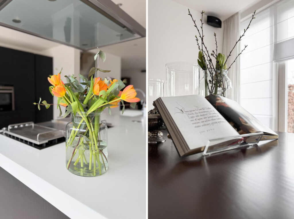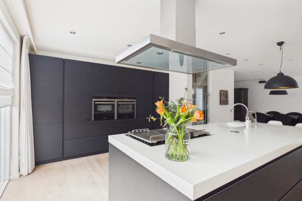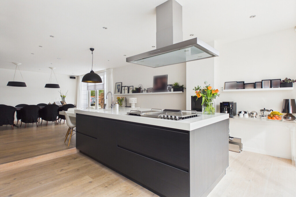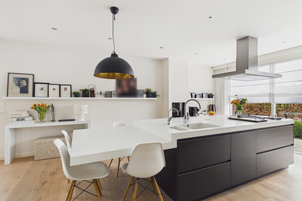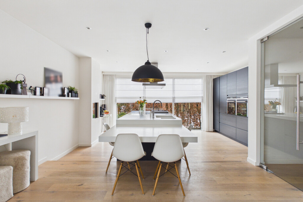 De eetkamer staat in directe verbinding met de open woonkeuken. Deze keuken vormt het hart van het huis en is uitgevoerd met een luxe inbouwkeuken en een royaal kookeiland. Hier vind je alle ruimte om uitgebreid te koken en gezellig samen te zijn. De keuken is voorzien van onder meer een Boretti fornuis, vaatwasser, afzuigkap, oven, combioven, warmhoudlade, koelkast en vriezer. Ook hier is aan sfeer gedacht met een tweede gashaard, waardoor de keuken niet alleen praktisch maar ook bijzonder gezellig aanvoelt.