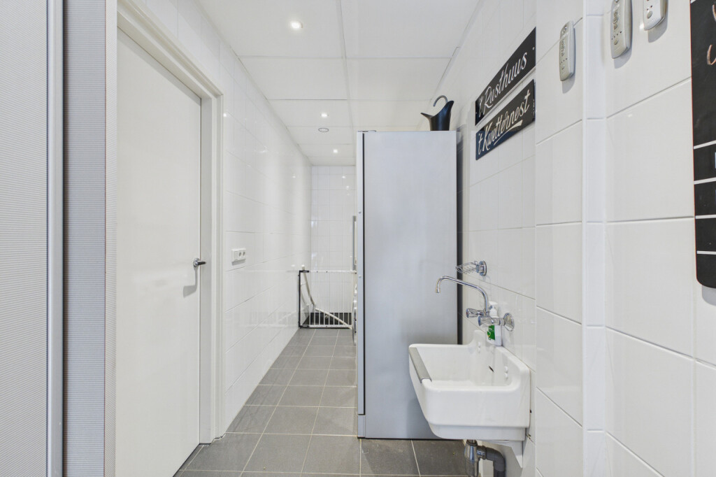 Vanuit de woonkamer is de bijkeuken bereikbaar. Deze ruimte beschikt over een vaste kastenwand, witgoedaansluitingen en een praktische toegang tot de kelder van circa 17 m². Daarnaast is er een deur naar de inpandige garage van circa 22 m². De garage is uitgerust met een elektrische garagedeur, een vaste schuifkastenwand en een loopdeur naar de tuin. n de kastenwand bevindt zich bovendien een praktische extra voorziening: een ingebouwde frituurpan met afzuigkap, handig geplaatst naast de deur.