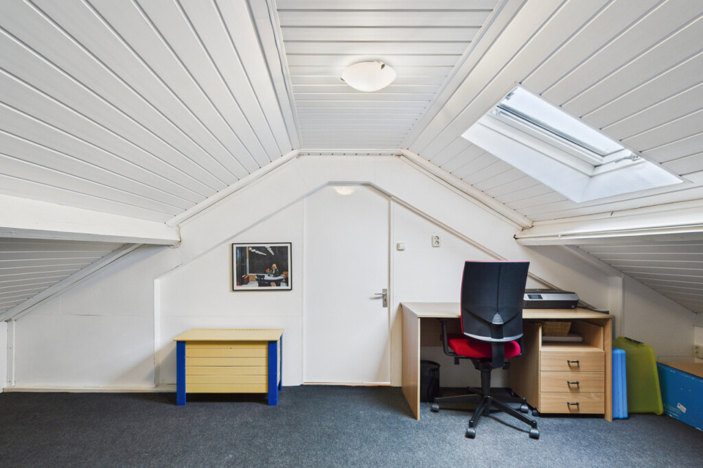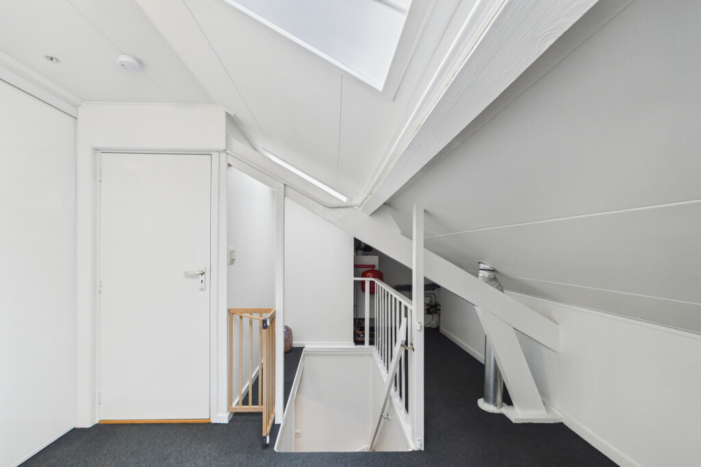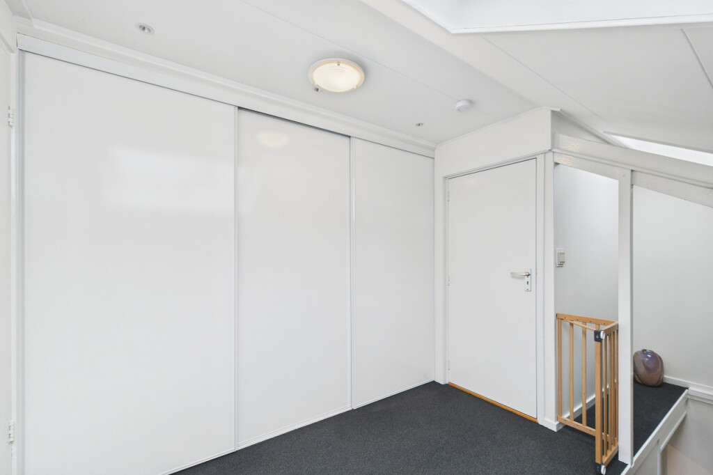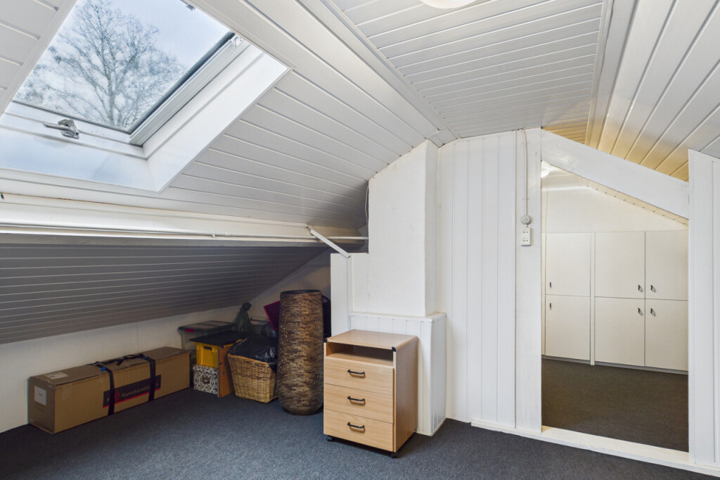 Op de eerste verdieping kom je op de overloop met een kastenwand en volop extra bergruimte. Hier bevindt zich 1 ruime en comfortabele slaapkamer. Daarnaast is er een hobbykamer aanwezig, die eenvoudig kan worden omgevormd tot een volwaardige vierde slaapkamer.