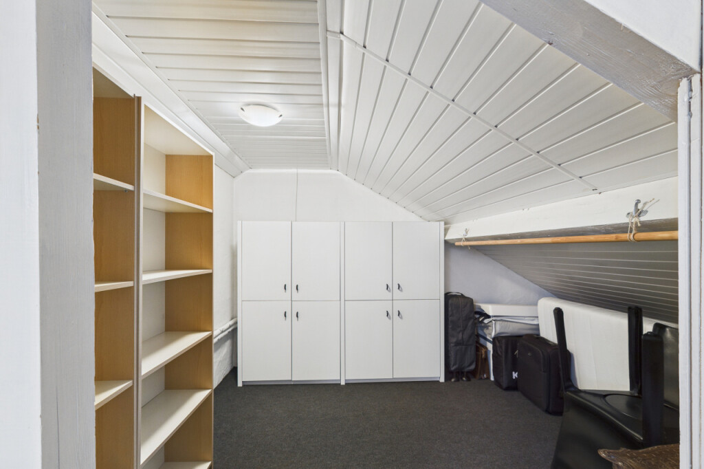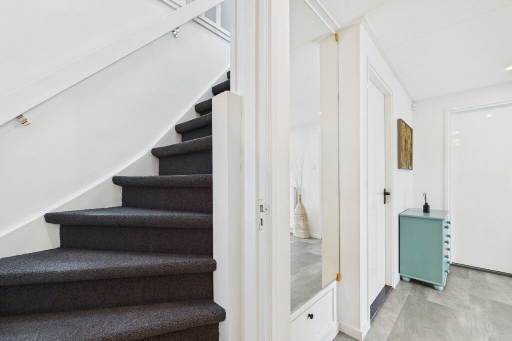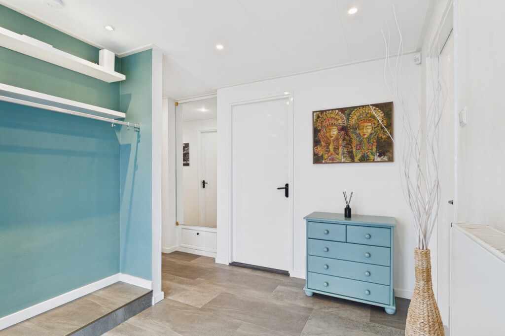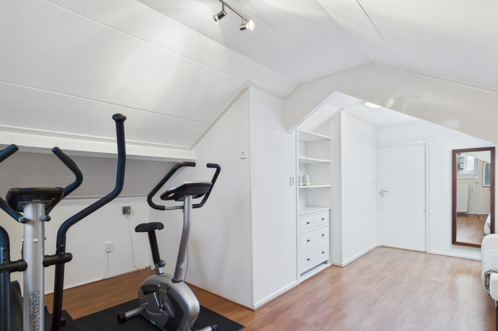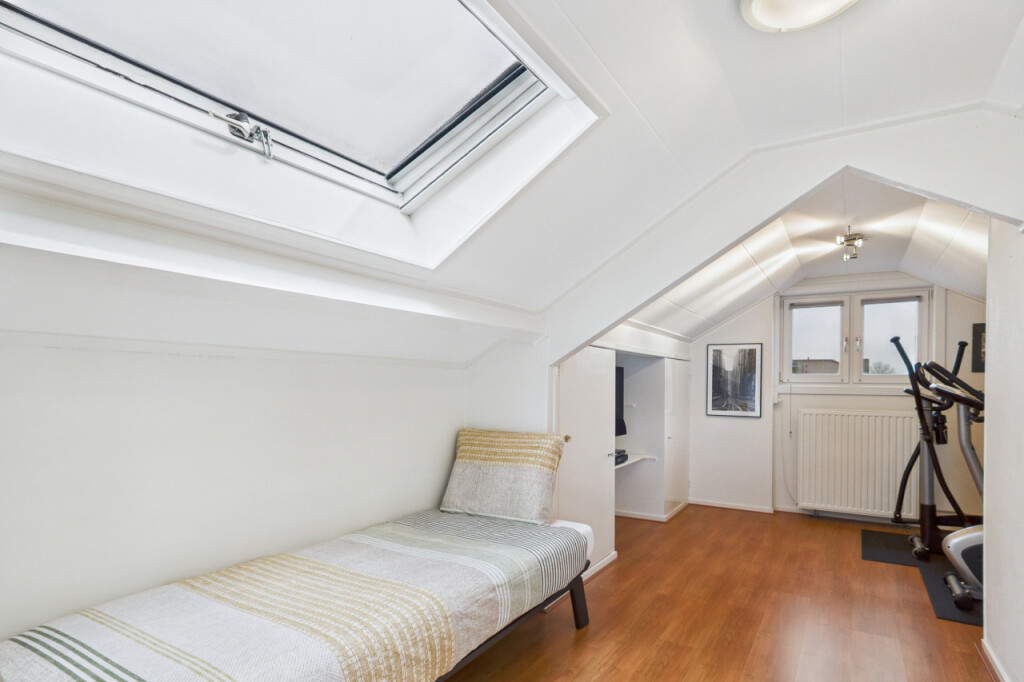 Op de eerste verdieping kom je op de overloop met een kastenwand en volop extra bergruimte. Hier bevindt zich 1 ruime en comfortabele slaapkamer. Daarnaast is er een hobbykamer aanwezig, die eenvoudig kan worden omgevormd tot een volwaardige vierde slaapkamer.