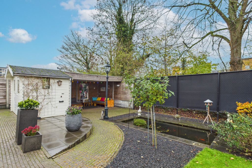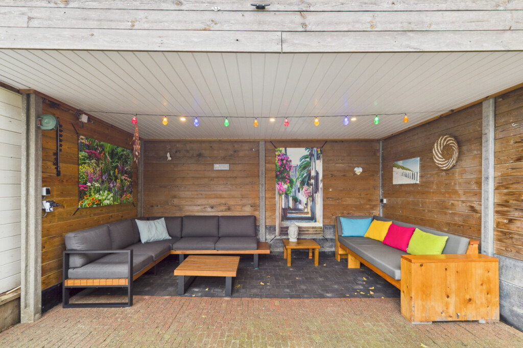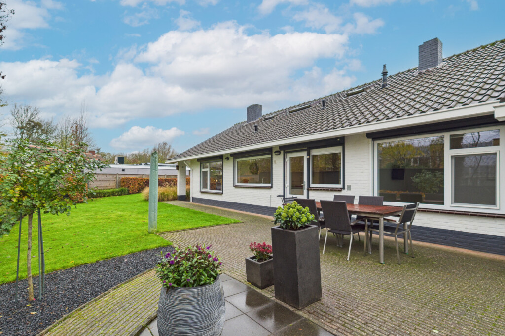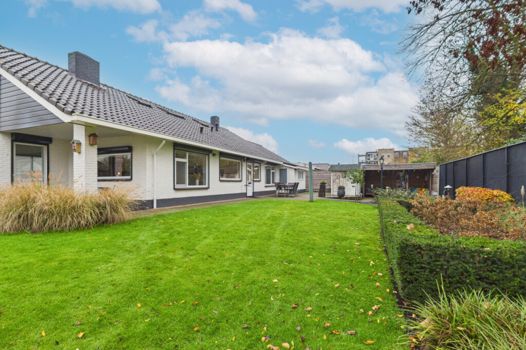 Rondom de woning ligt de ruime en verzorgde tuin die fraai is aangelegd en keurig wordt onderhouden. Je geniet hier van meerdere terrassen, een goed onderhouden gazon en kleurrijke bloem- en plantenborders. Daarnaast is de tuin voorzien van een overkapping en een houten tuinhuis, ideaal voor het opbergen van tuinspullen of het creëren van een extra plek om te ontspannen. Tevens beschikt de woning over een aangebouwde garage met elektra en water en is er een ruime oprit aanwezig voor het parkeren van de auto\'s.