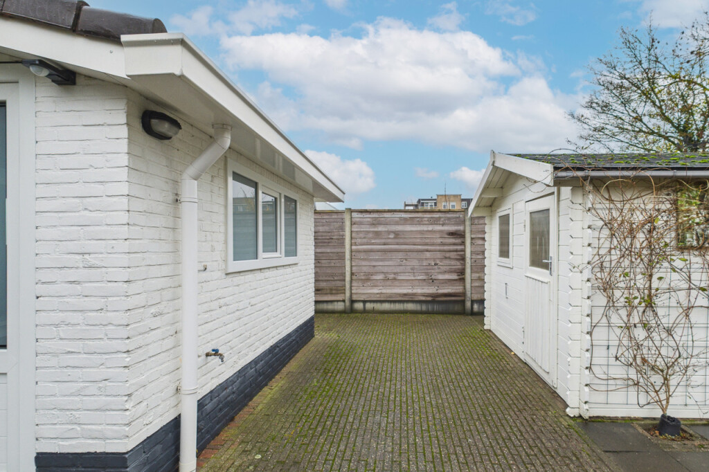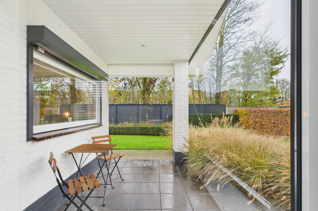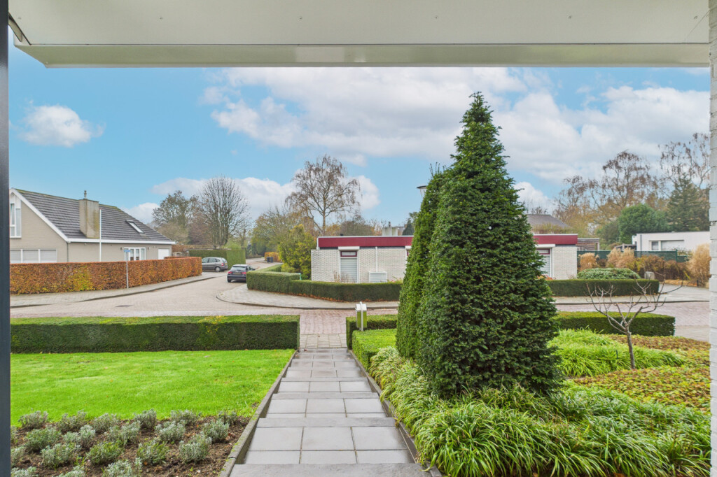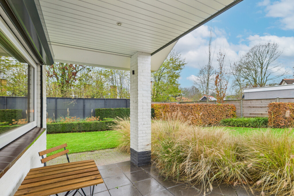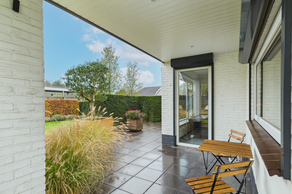Rondom de woning ligt de ruime en verzorgde tuin die fraai is aangelegd en keurig wordt onderhouden. Je geniet hier van meerdere terrassen, een goed onderhouden gazon en kleurrijke bloem- en plantenborders. Daarnaast is de tuin voorzien van een overkapping en een houten tuinhuis, ideaal voor het opbergen van tuinspullen of het creëren van een extra plek om te ontspannen. Tevens beschikt de woning over een aangebouwde garage met elektra en water en is er een ruime oprit aanwezig voor het parkeren van de auto\'s.