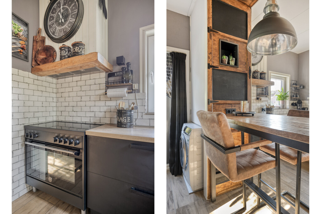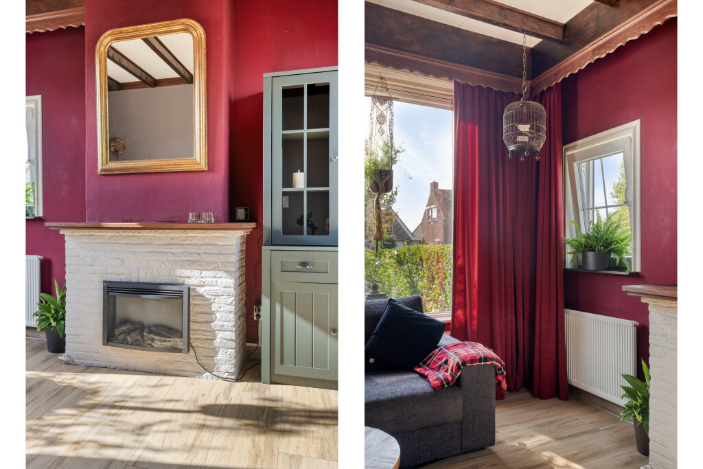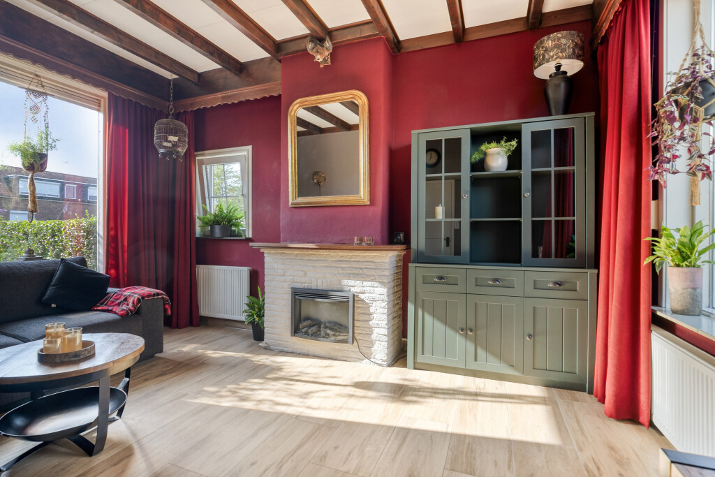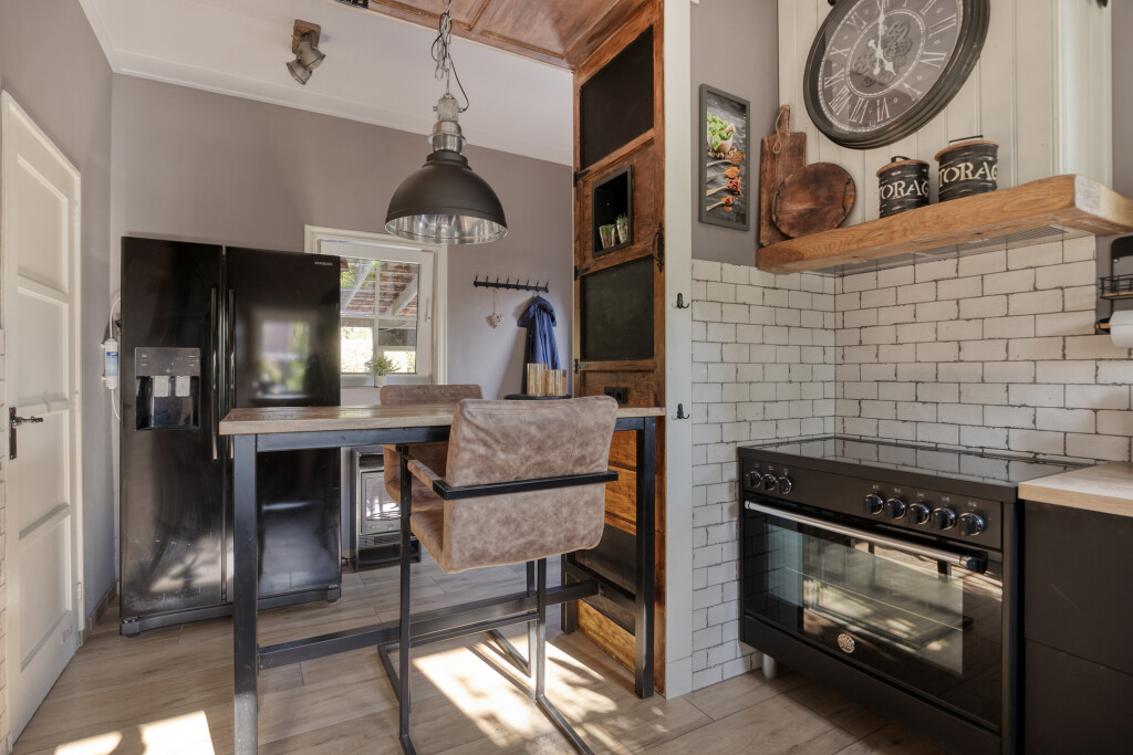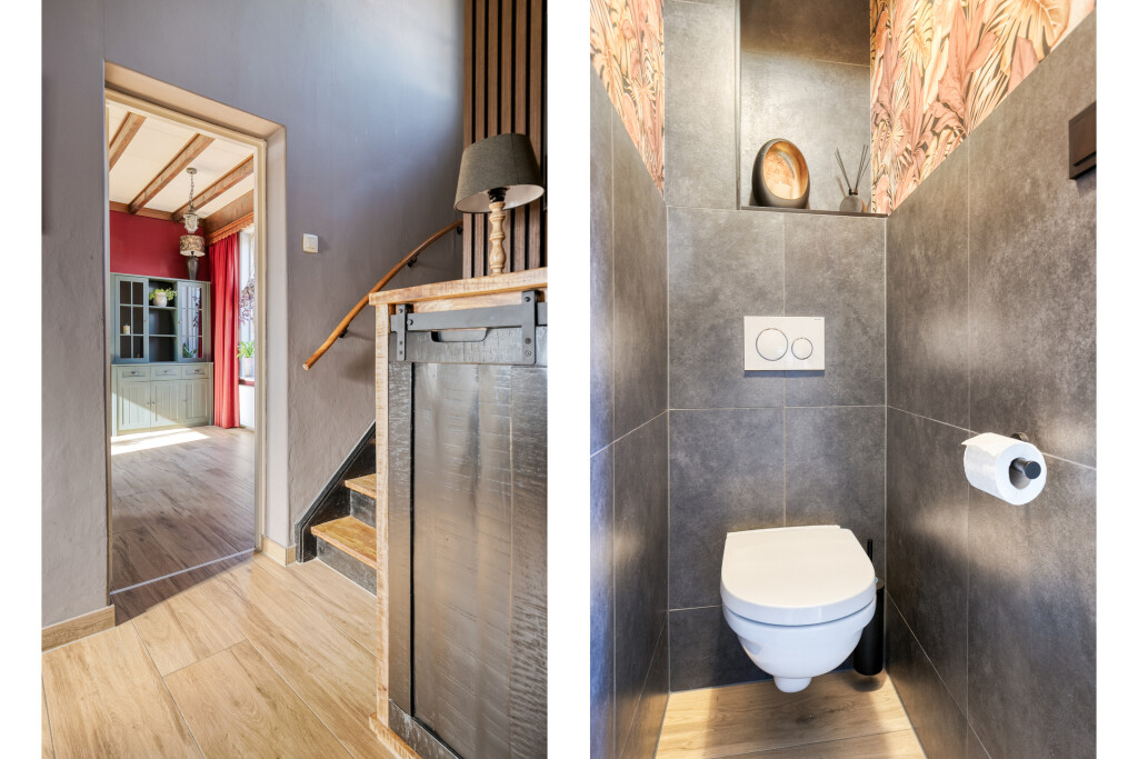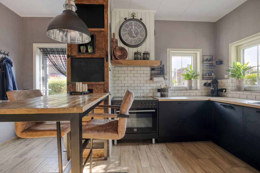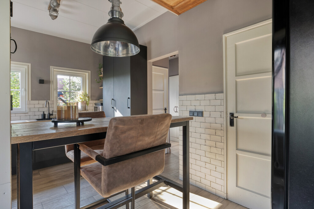 Bij binnenkomst sta je in de hal met het toilet, de meterkast en de trapopgang naar boven. Vanuit hier stap je de lichte doorzonwoonkamer binnen, waar de houten balken en de sfeervolle schouw direct in het oog springen. Een plek die uitnodigt tot ontspannen en samenzijn. De aangrenzende woonkeuken is ruim opgezet en voorzien van een donkere U-vormige keukenopstelling – ideaal om uitgebreid te koken én te tafelen.
