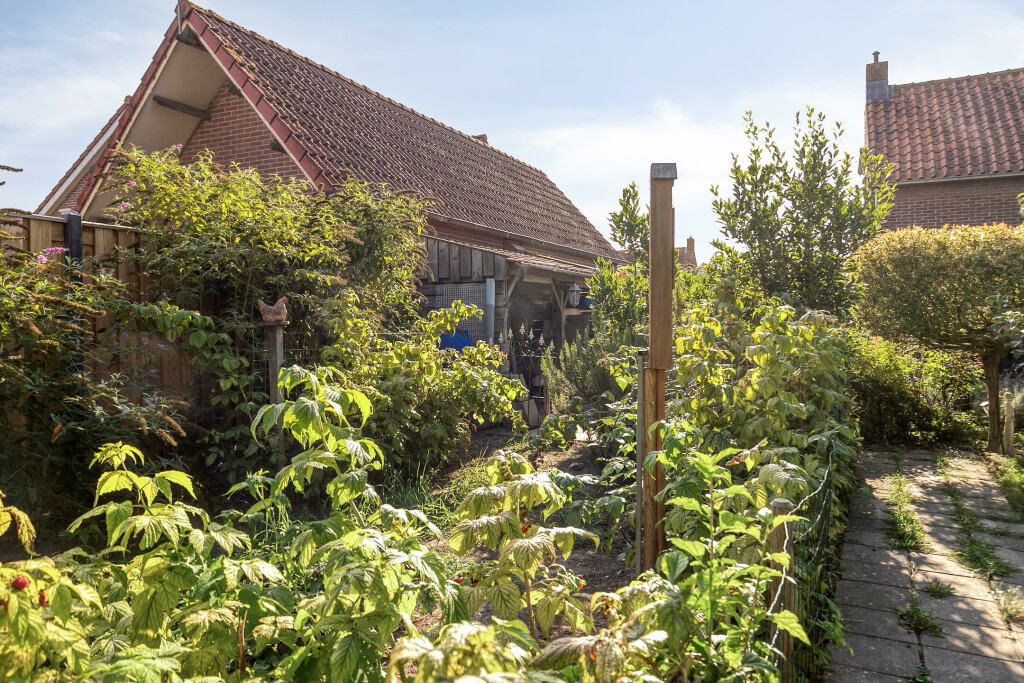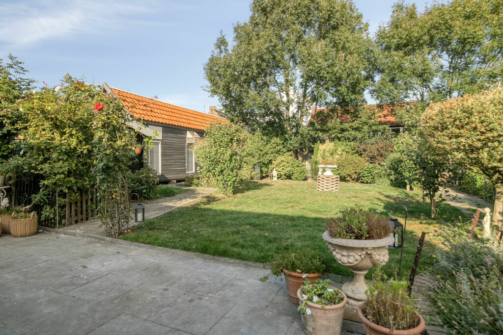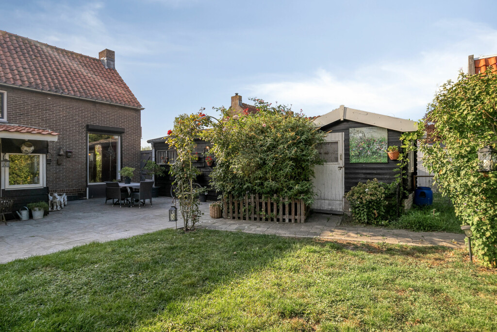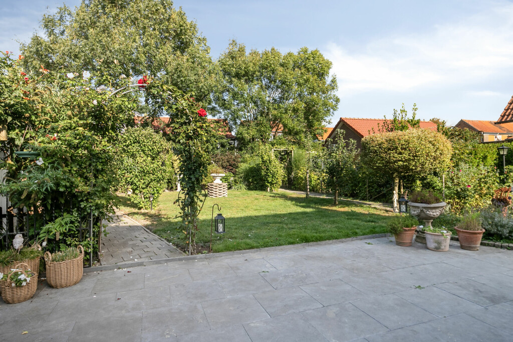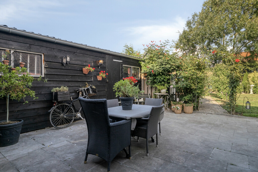 De tuin is een van de grootste troeven van deze woning. Gelegen op het westen geniet je hier volop van de middag- en avondzon. De tuin is fraai aangelegd met een terras, een gazon en kleurrijke borders, en dankzij de vrije achterom is hij ook praktisch in gebruik. Onder de houten overkapping met knusse zithoek kun je het hele jaar door buiten vertoeven. Verder zijn er een aangebouwde garage en een houten berging aanwezig, die samen zorgen voor veel extra opbergruimte en plek voor hobby’s.